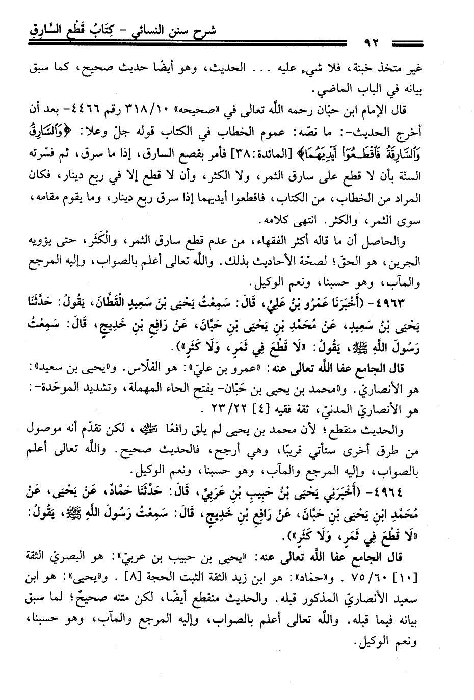 قَالَ الإمام ابن حبّان رحمه الله تعالى فِي "صحيحه" 10/ 318 رقم 4466 - بعد أن أخرج الْحَدِيث-: ما نصّه: عموم الخطاب فِي الكتاب قوله جلّ وعلا: {وَالسَّارِقُ وَالسَّارِقَةُ فَاقْطَعُوا أَيْدِيَهُمَا} [المائدة: 38]، فأمر بقصع السارق، إذا ما سرق، ثم فسرته السنّة بأن لا قطع عَلَى سارق الثمر، ولا الكثر، وأن لا قطع إلا فِي ربع دينار، فكان المراد منْ الخطاب، منْ الكتاب، فاقطعوا أيديهما إذا سرق ربع دينار، وما يقوم مقامه، سوى الثمر، والكثر. انتهى كلامه.