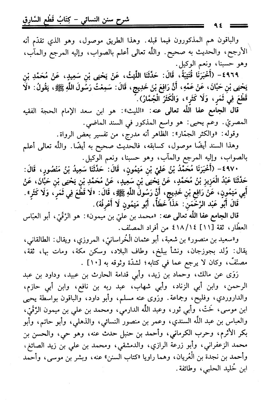 4970 - (أَخْبَرَنَا مُحَمَّدُ بْنُ عَلِيِّ بْنِ مَيْمُونٍ، قَالَ: حَدَّثَنَا سَعِيدُ بْنُ مَنْصُورٍ، قَالَ: حَدَّثَنَا عَبْدُ الْعَزِيزِ بْنُ مُحَمَّدٍ، عَنْ يَحْيَى بْنِ سَعِيدٍ، عَنْ مُحَمَّدِ بْنِ يَحْيَى بْنِ حَبَّانَ، عَنْ أَبِي مَيْمُونٍ، عَنْ رَافِعِ بْنِ خَدِيجٍ، أَنَّ رَسُولَ اللَّهِ -صلى الله عليه وسلم-، قَالَ: "لاَ قَطْعَ فِي ثَمَرٍ، وَلاَ كَثَرٍ".