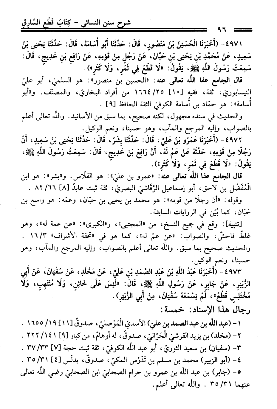 4971 - (أَخْبَرَنَا الْحُسَيْنُ بْنُ مَنْصُورٍ، قَالَ: حَدَّثَنَا أَبُو أُسَامَةَ، قَالَ: حَدَّثَنَا يَحْيَى بْنُ سَعِيدٍ، عَنْ مُحَمَّدِ بْنِ يَحْيَى بْنِ حَبَّانَ، عَنْ رَجُلٍ مِنْ قَوْمِهِ، عَنْ رَافِعِ بْنِ خَدِيجٍ، قَالَ: سَمِعْتُ رَسُولَ اللَّهِ -صلى الله عليه وسلم-، يَقُولُ: "لاَ قَطْعَ فِي ثَمَرٍ وَلاَ كَثَرٍ").