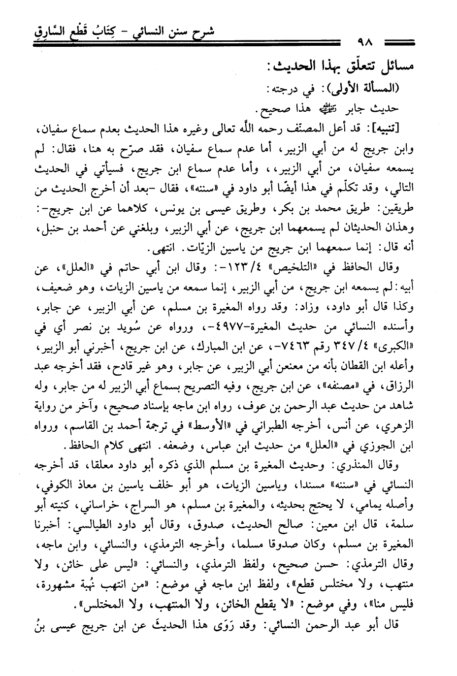 وَقَالَ الحافظ فِي "التلخيص" 4/ 123 - : وَقَالَ ابن أبي حاتم فِي "العلل"، عن أبيه: لم يسمعه ابن جريج، منْ أبي الزبير، إنما سمعه منْ ياسين الزيات، وهو ضعيف، وكذا قَالَ أبو داود، وزاد: وَقَدْ رواه المغيرة بن مسلم، عن أبي الزبير، عن جابر، وأسنده النسائيّ منْ حديث المغيرة -4977 - ، ورواه عن سُويد بن نصر أي فِي "الكبرى" 4/ 347 رقم 7463 - ، عن ابن المبارك، عن ابن جريج، أخبرني أبو الزبير، وأعله ابن القطّان بأنه منْ معنعن أبي الزبير، عن جابر، وهو غير قادح، فقد أخرجه عبد الرزاق، فِي "مصنفه"، عن ابن جريج، وفيه التصريح بسماع أبي الزبير له منْ جابر، وله شاهد منْ حديث عبد الرحمن بن عوف، رواه ابن ماجه بإسناد صحيح، وآخر منْ رواية الزهريّ، عن أنس، أخرجه الطبراني فِي "الأوسط" فِي ترجمة أحمد بن القاسم، ورواه ابن الجوزي فِي "العلل" منْ حديث ابن عباس، وضعفه. انتهى كلام الحافظ.