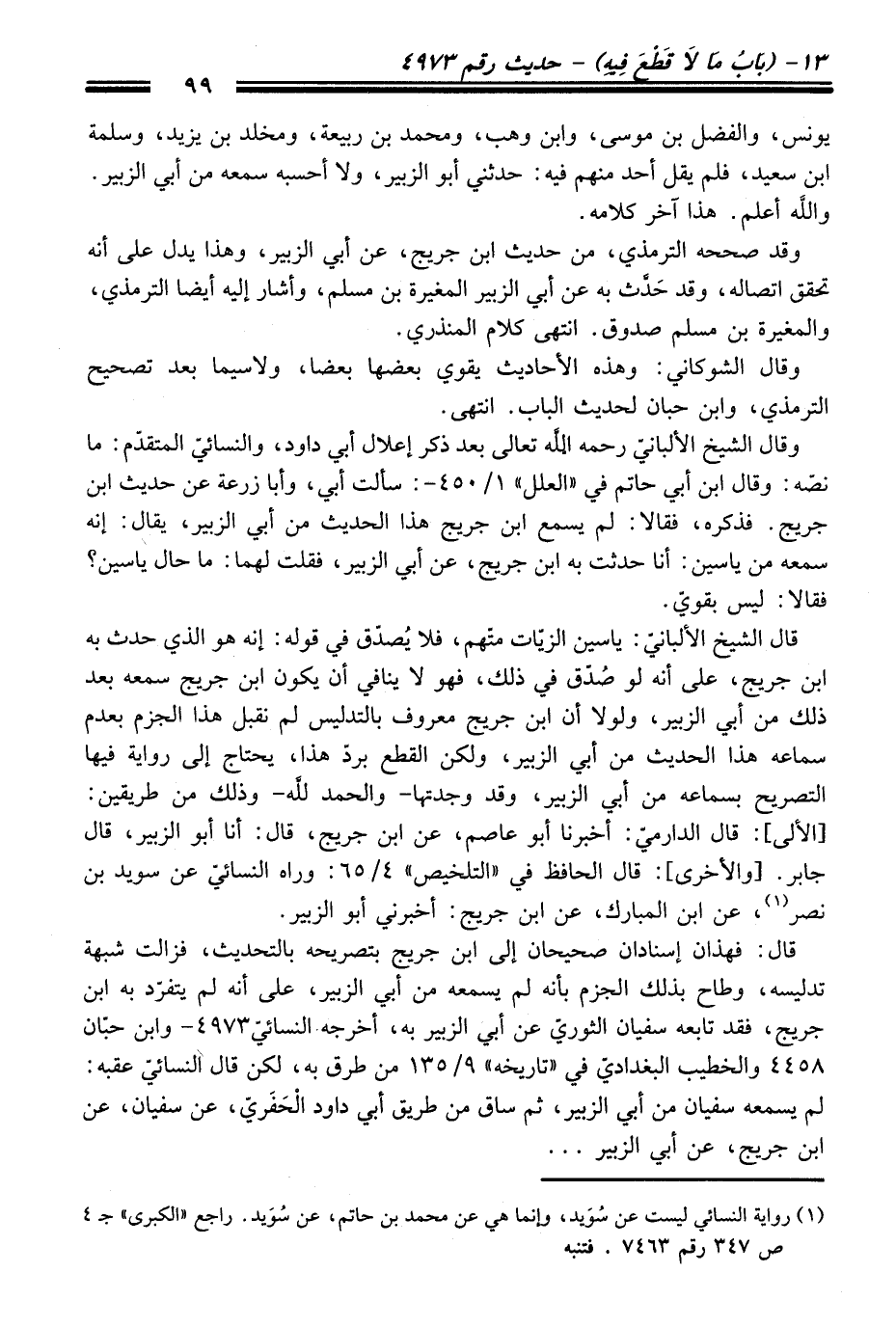 قَالَ الشيخ الألبانيّ: ياسين الزيّات متّهم، فلا يُصدّق فِي قوله: إنه هو الذي حدث به ابن جريج، عَلَى أنه لو صُدّق فِي ذلك، فهو لا ينافي أن يكون ابن جريج سمعه بعد ذلك منْ أبي الزبير، ولولا أن ابن جريج معروف بالتدليس لم نقبل هَذَا الجزم بعدم سماعه هَذَا الْحَدِيث منْ أبي الزبير، ولكن القطع بردّ هَذَا، يحتاج إلى رواية فيها التصريح بسماعه منْ أبي الزبير، وَقَدْ وجدتها -والحمد لله- وذلك منْ طريقين: [الأولى]: قَالَ الدارميّ: أخبرنا أبو عاصم، عن ابن جريج، قَالَ: أنا أبو الزبير، قَالَ جابر. [والأخرى]: قَالَ الحافظ فِي "التلخيص" 4/ 65: وراه النسائيّ عن سويد بن نصر (¬1)، عن ابن المبارك، عن ابن جريج: أخبرني أبو الزبير.