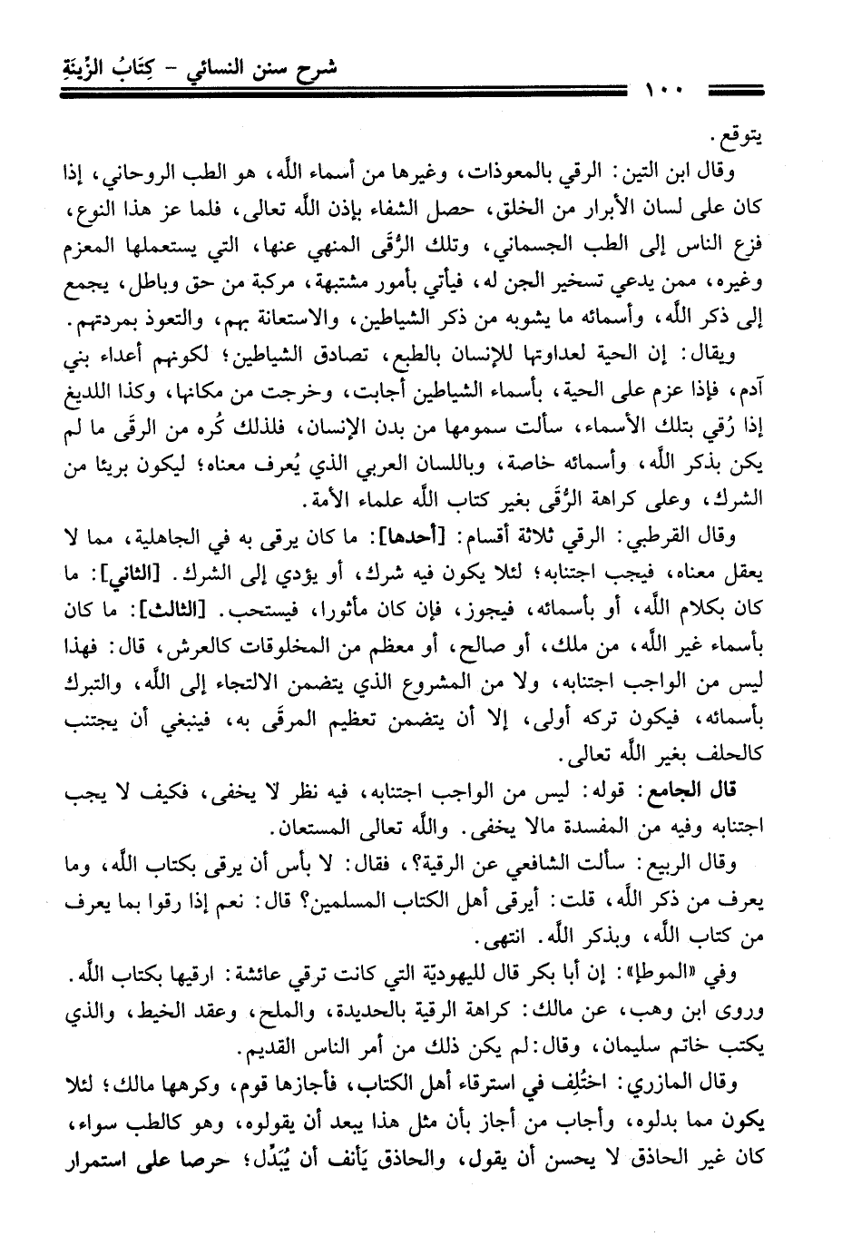 وَقَالَ ابن التين: الرقي بالمعوذات، وغيرها منْ أسماء الله، هو الطب الروحاني، إذا كَانَ عَلَى لسان الأبرار منْ الخلق، حصل الشفاء بإذن الله تعالى، فلما عز هَذَا النوع، فزع النَّاس إلى الطب الجسماني، وتلك الرُّقَى المنهي عنها، التي يستعملها المعزم وغيره، ممن يدعي تسخير الجن له، فيأتي بأمور مشتبهة، مركبة منْ حق وباطل، يجمع إلى ذكر الله، وأسمائه ما يشوبه منْ ذكر الشياطين، والاستعانة بهم، والتعوذ بمردتهم.