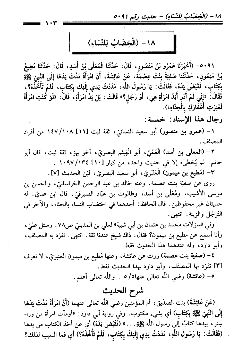 5091 - (أَخْبَرَنَا عَمْرُو بْنُ مَنْصُورٍ، قَالَ: حَدَّثَنَا الْمُعَلَّى بْنُ أَسَدٍ، قَالَ: حَدَّثَنَا مُطِيعُ بْنُ مَيْمُونٍ، حَدَّثَتْنَا صَفِيَّةُ بِنْتُ عِصْمَةَ، عَنْ عَائِشَةَ، أَنَّ امْرَأَةً مَدَّتْ يَدَهَا إِلَى النَّبِيِّ -صلى الله عليه وسلم- بِكِتَابٍ، فَقَبَضَ يَدَهُ، فَقَالَتْ: يَا رَسُولَ اللَّهِ، مَدَدْتُ يَدِي إِلَيْكَ بِكِتَابٍ، فَلَمْ تَأْخُذْهُ؟، فَقَالَ: "إِنِّي لَمْ أَدْرِ أَيَدُ امْرَأَةٍ هِيَ أَوْ رَجُلٍ؟ " قَالَتْ: بَلْ يَدُ امْرَأَةٍ، قَالَ: "لَوْ كُنْتِ امْرَأَةً لَغَيَّرْتِ أَظْفَارَكِ بِالْحِنَّاءِ").
