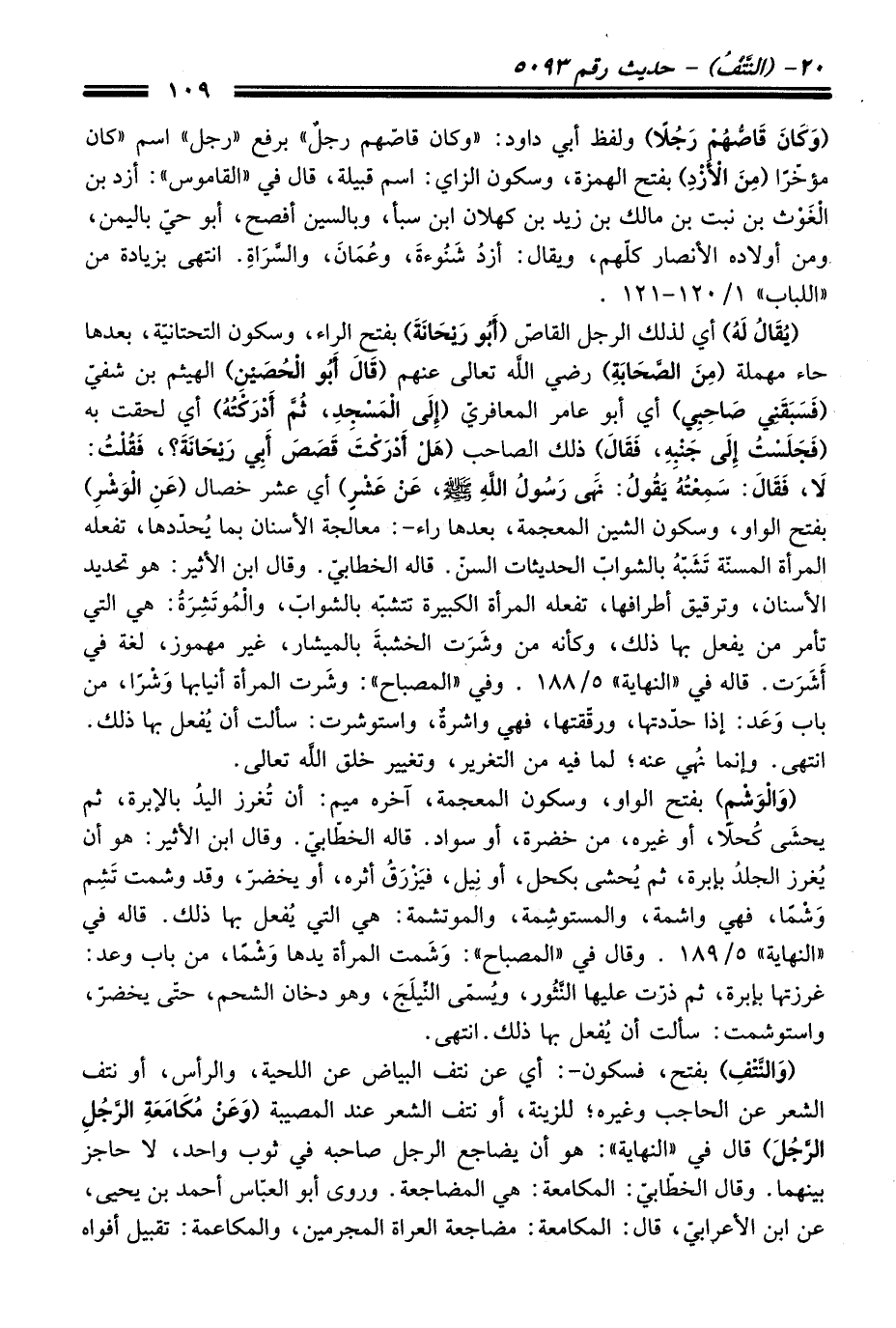 (يُقَالُ لَهُ) أي لذلك الرجل القاصّ (أبُو رَيْحَانَةَ) بفتح الراء، وسكون التحتانيّة، بعدها حاء مهملة (مِنَ الصَّحَابَةِ) رضي الله تعالى عنهم (قَالَ أبُو الْحُصَيْنِ) الهيثم بن شفيّ (فَسَبَقَنِي صَاحِبِي) أي أبو عامر المعافريّ (إِلَى الْمَسْجِدِ، ثُمَّ أَدْرَكْتُهُ) أي لحقت به (فَجَلَسْتُ إِلَى جَنْبِهِ، فَقَالَ) ذلك الصاحب (هَلْ أَدْرَكْتَ قَصَصَ أَبِي رَيْحَانَةَ؟، فَقُلْتُ: لاَ، فَقَالَ: سَمِعْتُهُ يَقُولُ: نَهَى رَسُولُ اللَّهِ -صلى الله عليه وسلم- عَنْ عَشْرٍ) أي عشر خصال (عَنِ الْوَشْرِ) بفتح الواو، وسكون الشين المعجمة، بعدها راء-: معالجة الأسنان بما يُحدّدها، تفعله المرأة المسنّة تَشَبّهُ بالشوابّ الحديثات السنّ. قاله الخطّابيّ. وَقَالَ ابن الأثير: هو تحديد الأسنان، وترقيق أطرافها، تفعله المرأة الكبيرة تتشبّه بالشوابّ، والْمُوتَشِرَةُ: هي التي تأمر منْ يفعل بها ذلك، وكأنه منْ وشَرَت الخشبةَ بالميشار، غير مهموز، لغة فِي أَشَرَت. قاله فِي "النهاية" 5/ 188. وفي "المصباح": وشَرت المرأة أنيابها وَشْراً، منْ باب وَعَد: إذا حدّدتها، ورقّقتها، فهي واشرةٌ، واستوشرت: سألت أن يُفعل بها ذلك. انتهى. وإنما نُهي عنه؛ لما فيه منْ التغرير، وتغيير خلق الله تعالى.