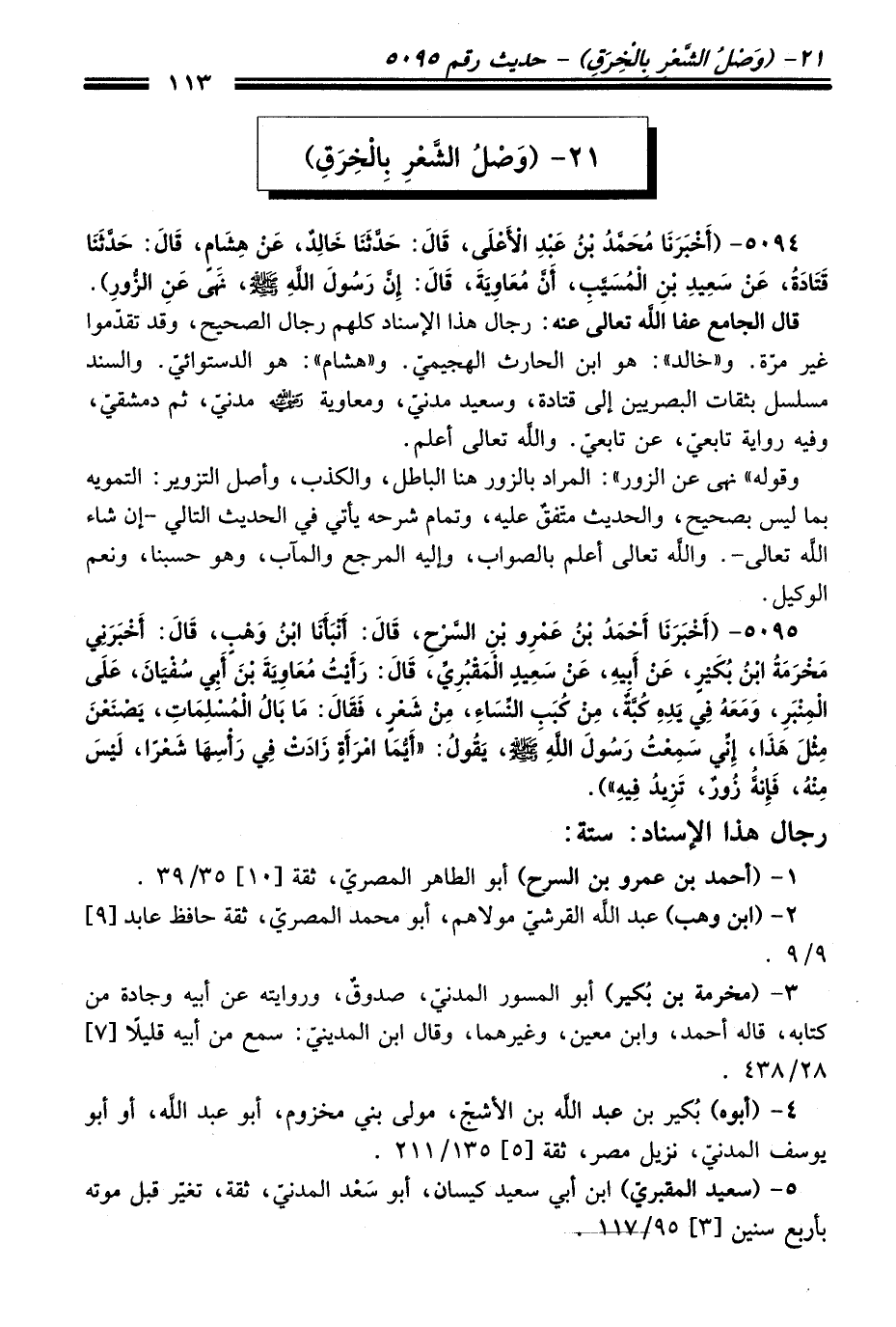 5095 - أَخْبَرَنَا أَحْمَدُ بْنُ عَمْرِو بْنِ السَّرْحِ، قَالَ: أَنْبَأَنَا ابْنُ وَهْبٍ، قَالَ: أَخْبَرَنِي مَخْرَمَةُ بْنُ بُكَيْرٍ، عَنْ أَبِيهِ، عَنْ سَعِيدٍ الْمَقْبُرِيِّ، قَالَ: رَأَيْتُ مُعَاوِيَةَ بْنَ أَبِي سُفْيَانَ، عَلَى الْمِنْبَرِ، وَمَعَهُ فِي يَدِهِ كُبَّةٌ، مِنْ كُبَبِ النِّسَاءِ، مِنْ شَعْرٍ، فَقَالَ: مَا بَالُ الْمُسْلِمَاتِ، يَصْنَعْنَ مِثْلَ هَذَا، إِنِّي سَمِعْتُ رَسُولَ اللَّهِ -صلى الله عليه وسلم-، يَقُولُ: "أَيُّمَا امْرَأَةٍ زَادَتْ فِي رَأْسِهَا شَعْرًا، لَيْسَ مِنْهُ، فَإِنَّهُ زُورٌ، تَزِيدُ فِيهِ").