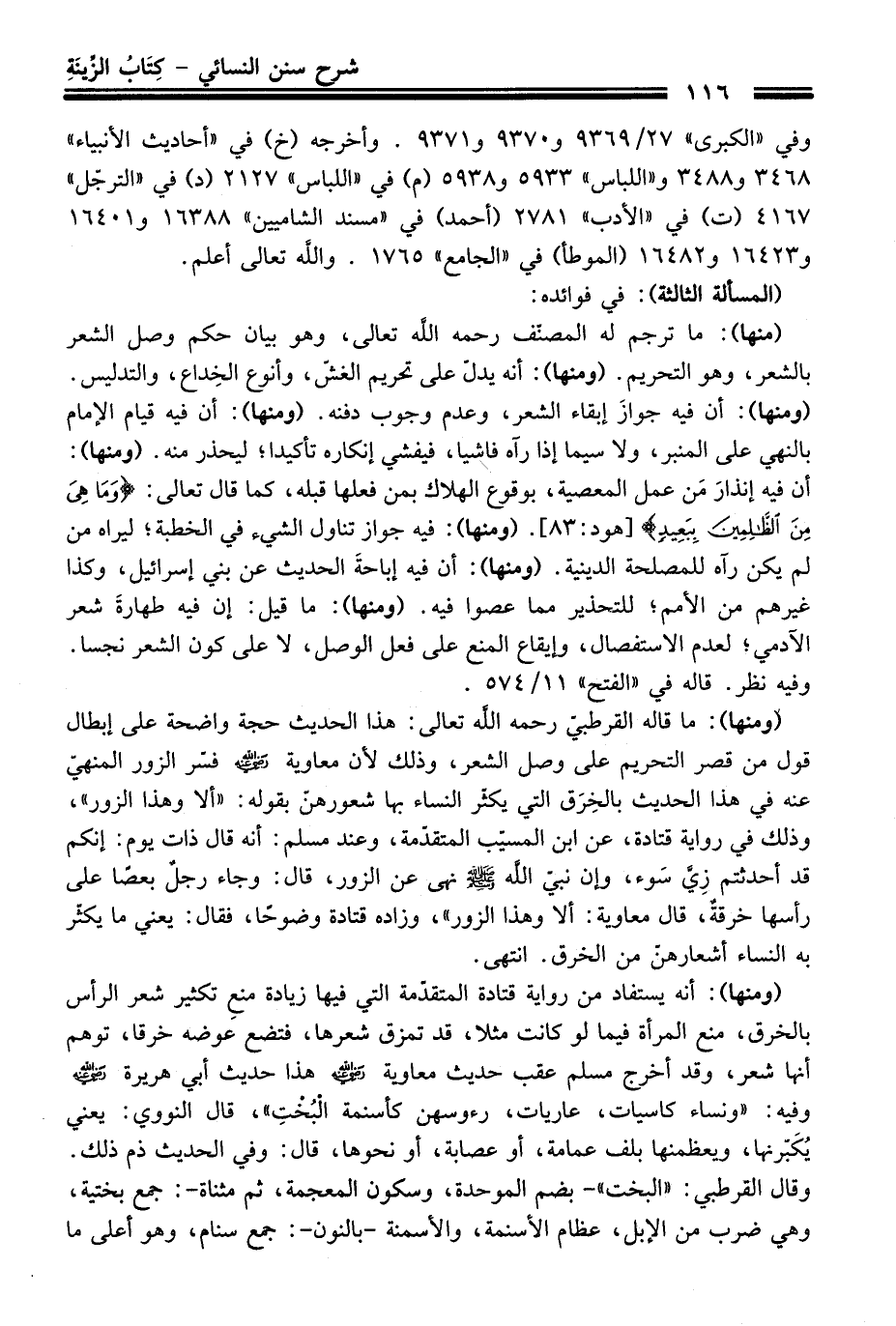 (ومنها): أنه يستفاد منْ رواية قتادة المتقدّمة التي فيها زيادة منعِ تكثير شعر الرأس بالخرق، منع المرأة فيما لو كانت مثلا، قد تمزق شعرها، فتضع عوضه خرقا، توهم أنها شعر، وَقَدْ أخرج مسلم عقب حديث معاوية -رضي الله عنه- هَذَا حديث أبي هريرة -رضي الله عنه- وفيه: "ونساء كاسيات، عاريات، رءوسهن كأسنمة الْبُخْتِ"، قَالَ النوويّ: يعني يُكَبّرنها، ويعظمنها بلف عمامة، أو عصابة، أو نحوها، قَالَ: وفي الْحَدِيث ذم ذلك. وَقَالَ القرطبيّ: "البخت" -بضم الموحدة، وسكون المعجمة، ثم مثناة-: جمع بختية، وهي ضرب منْ الإبل، عظام الأسنمة، والأسمنة -بالنون-: جمع سنام، وهو أعلى ما