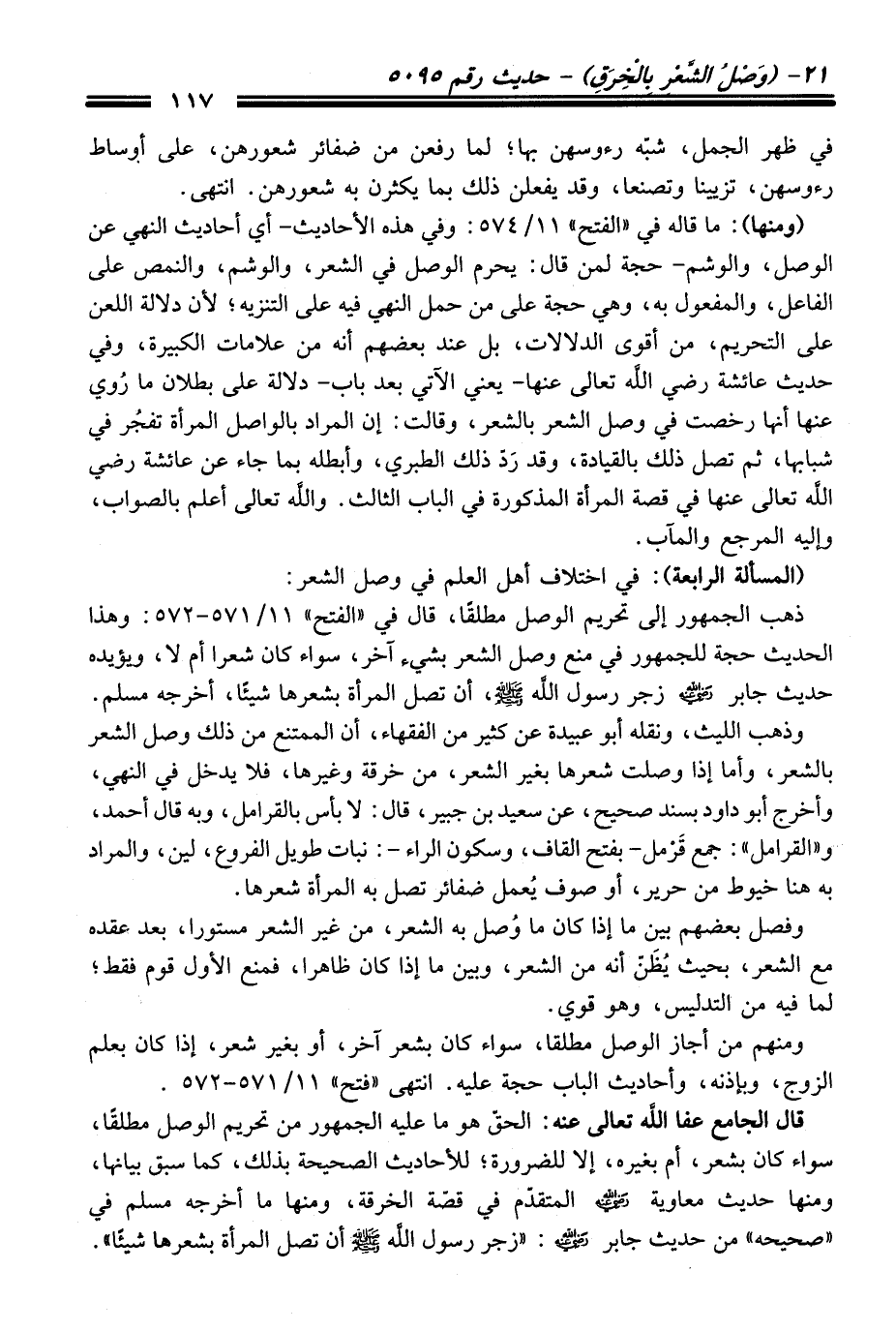 قَالَ الجامع عفا الله تعالى عنه: الحقّ هو ما عليه الجمهور منْ تحريم الوصل مطلقاً، سواء كَانَ بشعر، أم بغيره، إلا للضرورة؛ للأحاديث الصحيحة بذلك، كما سبق بيانها، ومنها حديث معاوية -رضي الله عنه- المتقدّم فِي قصّة الخرقة، ومنها ما أخرجه مسلم فِي "صحيحه" منْ حديث جابر -رضي الله عنه-: "زجر رسول الله -صلى الله عليه وسلم- أن تصل المرأة بشعرها شيئًا".