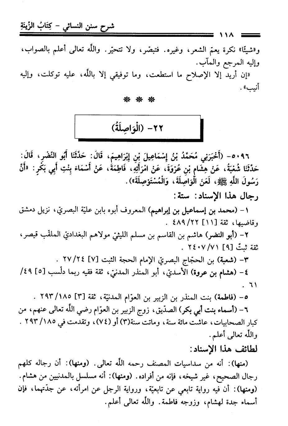 5096 - (أَخْبَرَنِي مُحَمَّدُ بْنُ إِسْمَاعِيلَ بْنِ إِبْرَاهِيمَ، قَالَ: حَدَّثَنَا أَبُو النَّضْرِ، قَالَ: حَدَّثَنَا شُعْبَةُ، عَنْ هِشَامِ بْنِ عُرْوَةَ، عَنِ امْرَأَتِهِ، فَاطِمَةَ، عَنْ أَسْمَاءَ بِنْتِ أَبِي بَكْرٍ: "أَنَّ رَسُولَ اللَّهِ -صلى الله عليه وسلم-، لَعَنَ الْوَاصِلَةَ، وَالْمُسْتَوْصِلَةَ").