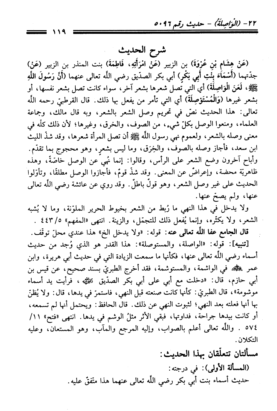 [تنبيه]: قوله: "الواصلة، والمستوصلة": هَذَا القدر هو الذي وُجد منْ حديث أسماء رضي الله تعالى عنها، فكأنها ما سمعت الزيادة التي فِي حديث أبي هريرة، وابن عمر -رضي الله عنهم- فِي الواشمة، والمستوشمة، فقد أخرج الطبريّ بسند صحيح، عن قيس بن أبي حازم، قَالَ: "دخلت مع أبي عَلَى أبي بكر الصدّيق -رضي الله عنه-، فرأيت يد أسماء موشومة"، قَالَ الطبريّ: كأنها كانت صنعته قبل النهي، فاستمرّ فِي يدها، قَالَ: ولا يُظنّ بها أنها فعلته بعد النهي؛ لثبوت النهي عن ذلك. قَالَ الحافظ: ويحتمل أنها لم تسمعه، أو كانت بيدها جراحة، فداوتها، فبقي الأثر مثلُ الوشم فِي يدها. انتهى "فتح" 11/ 574. والله تعالى أعلم بالصواب، وإليه المرجع والمآب، وهو المستعان، وعليه التكلان.