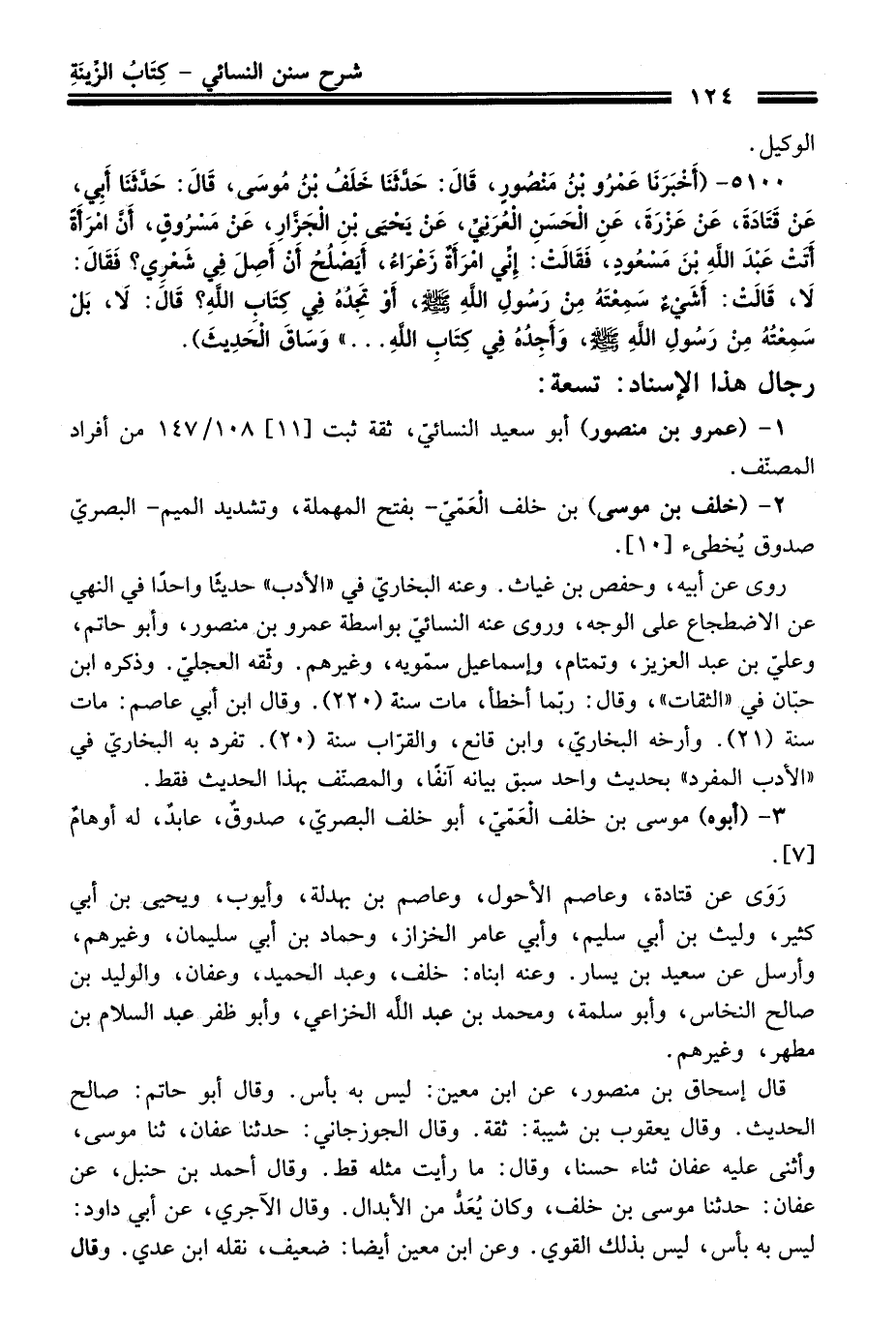 5100 - (أَخْبَرَنَا عَمْرُو بْنُ مَنْصُورٍ، قَالَ: حَدَّثَنَا خَلَفُ بْنُ مُوسَى، قَالَ: حَدَّثَنَا أَبِي، عَنْ قَتَادَةَ، عَنْ عَزْرَةَ، عَنِ الْحَسَنِ الْعُرَنِيِّ، عَنْ يَحْيَى بْنِ الْجَزَّارِ، عَنْ مَسْرُوقٍ، أَنَّ امْرَأَةً أَتَتْ عَبْدَ اللَّهِ بْنَ مَسْعُودٍ، فَقَالَتْ: إِنِّي امْرَأَةٌ زَعْرَاءُ، أَيَصْلُحُ أَنْ أَصِلَ فِي شَعْرِي؟ فَقَالَ: لاَ، قَالَتْ: أَشَيْءٌ سَمِعْتَهُ مِنْ رَسُولِ اللَّهِ -صلى الله عليه وسلم-، أَوْ تَجِدُهُ فِي كِتَابِ اللَّهِ؟ قَالَ: لاَ، بَلْ سَمِعْتُهُ مِنْ رَسُولِ اللَّهِ -صلى الله عليه وسلم-، وَأَجِدُهُ فِي كِتَابِ اللَّهِ ... " وَسَاقَ الْحَدِيثَ).