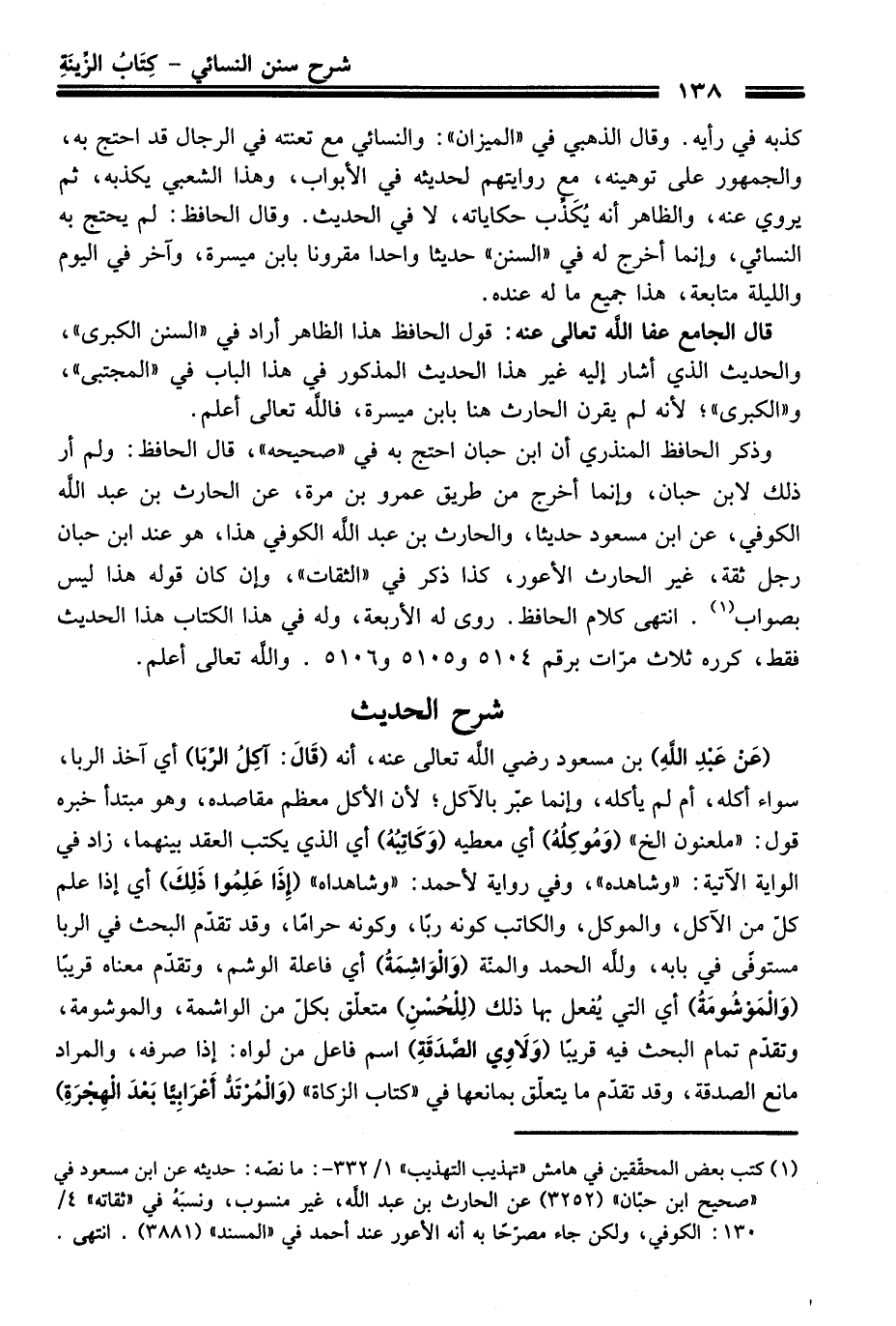 وذكر الحافظ المنذري أن ابن حبّان احتج به فِي "صحيحه"، قَالَ الحافظ: ولم أر ذلك لابن حبّان، وإنما أخرج منْ طريق عمرو بن مرة، عن الحارث بن عبد الله الكوفيّ، عن ابن مسعود حديثا، والحارث بن عبد الله الكوفيّ هَذَا، هو عند ابن حبّان رجل ثقة، غير الحارث الأعور، كذا ذكر فِي "الثقات"، وإن كَانَ قوله هَذَا ليس بصواب (¬1). انتهى كلام الحافظ. رَوَى له الأربعة، وله فِي هَذَا الكتاب هَذَا الْحَدِيث فقط، كرره ثلاث مرّات برقم 5104 و5105 و5106. والله تعالى أعلم.