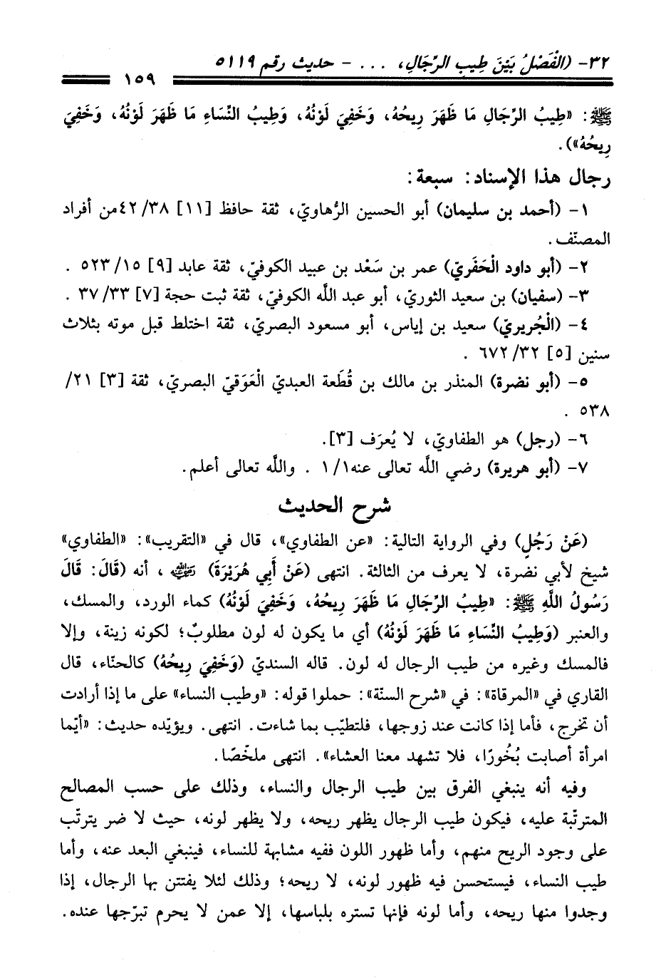 وفيه أنه ينبغي الفرق بين طيب الرجال والنساء، وذلك عَلَى حسب المصالح المترتّبة عليه، فيكون طيب الرجال يظهر ريحه، ولا يظهر لونه، حيث لا ضر يترتّب عَلَى وجود الريح منهم، وأما ظهور اللون ففيه مشابهة للنساء، فينبغي البعد عنه، وأما طيب النِّساء، فيستحسن فيه ظهور لونه، لا ريحه؛ وذلك لئلا يفتتن بها الرجال، إذا وجدوا منها ريحه، وأما لونه فإنها تستره بلباسها، إلا عمن لا يحرم تبرّجها عنده.
