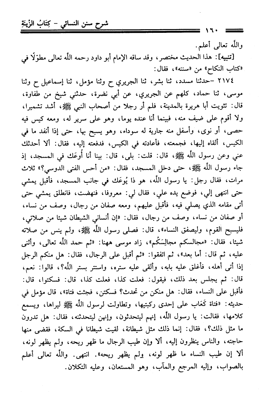 2174 - حدثنا مسدد، ثنا بشر، ثنا الجريري ح وثنا مؤمل، ثنا إسماعيل ح وثنا موسى، ثنا حماد، كلهم عن الجريري، عن أبي نضرة، حدثني شيخ منْ طفاوة، قَالَ: تثويت أبا هريرة بالمدينة، فلم أر رجلا منْ أصحاب النبيّ -صلى الله عليه وسلم-، أشد تشميرا، ولا أقوم عَلَى ضيف منه، فبينما أنا عنده يوما، وهو عَلَى سرير له، ومعه كيس فيه حصى، أو نوى، وأسفل منه جارية له سوداء، وهو يسبح بها، حَتَّى إذا أنفد ما فِي الكيس، ألقاه إليها، فجمعته، فأعادته فِي الكيس، فدفعته إليه، فَقَالَ: ألا أحدثك عني وعن رسول الله -صلى الله عليه وسلم-، قَالَ: قلت: بلى، قَالَ: بينا أنا أُوعَك فِي المسجد، إذ جاء رسول الله -صلى الله عليه وسلم-، حَتَّى دخل المسجد، فَقَالَ: "منْ أحس الفتى الدوسي؟ " ثلاث مرات، فَقَالَ رجل: يا رسول الله -صلى الله عليه وسلم-، هو ذا يُوعَك فِي جانب المسجد، فأقبل يمشي حَتَّى انتهى إلي، فوضع يده عليّ، فَقَالَ لي: معروفا، فنهضت، فانطلق يمشي حَتَّى أتى مقامه الذي يصلي فيه، فأقبل عليهم، ومعه صفان منْ رجال، وصف منْ نساء، أو صفان منْ نساء، وصف منْ رجال، فَقَالَ: "إن أنساني الشيطان شيئا منْ صلاتي، فليسبح القوم، وليصفق النِّساء"، قَالَ: فصلى رسول الله -صلى الله عليه وسلم-، ولم ينس منْ صلاته شيئا، فَقَالَ: "مجالسكم مجالِسَكُم"، زاد موسى هاهنا: "ثم حمد الله تعالى، وأثنى عليه، ثم قَالَ: أما بعد"، ثم اتفقوا: "ثم أقبل عَلَى الرجال، فَقَالَ: هل منكم الرجل إذا أتى أهله، فأغلق عليه بابه، وألقى عليه ستره، واستتر بستر الله؟، قالوا: نعم، قال: ثم يجلس بعد ذلك، فيقول: فعلت كذا، فعلت كذا، قَالَ: فسكتوا، قَالَ: فأقبل عَلَى النِّساء، فَقَالَ: هل منكن منْ تحدث؟ فسكتن، فجثت فتاة"، قَالَ مؤمل فِي حديثه: "فتاة كَعَاب عَلَى إحدى ركبتيها، وتطاولت لرسول الله -صلى الله عليه وسلم- ليراها، ويسمع كلامها، فقالت: يا رسول الله -صلى الله عليه وسلم-، إنهم ليتحدثون، وإنهن ليتحدثنه، فَقَالَ: هل تدرون ما مثل ذلك؟، فَقَالَ: إنما ذلك مثل شيطانة، لقيت شيطانا فِي السكة، فقضى منها حاجته، والناس ينظرون إليه، ألا وإن طيب الرجال ما ظهر ريحه، ولم يظهر لونه، ألا إن طيب النِّساء ما ظهر لونه، ولم يظهر ريحه". انتهى. والله تعالى أعلم بالصواب، وإليه المرجع والمآب، وهو المستعان، وعليه التكلان.