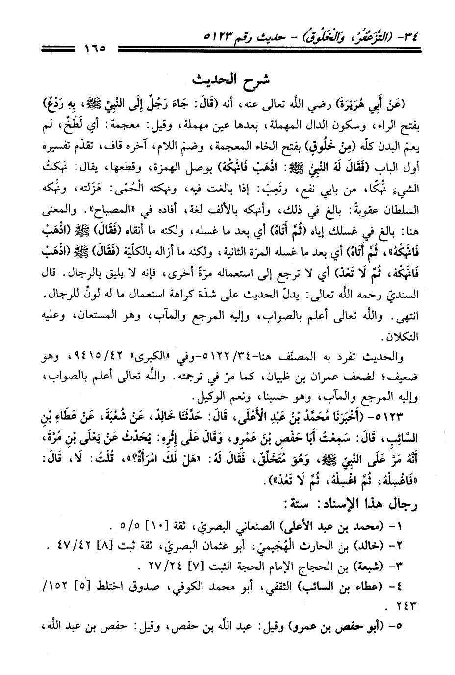 5123 - (أَخْبَرَنَا مُحَمَّدُ بْنُ عَبْدِ الأَعْلَى، قَالَ: حَدَّثَنَا خَالِدٌ، عَنْ شُعْبَةَ، عَنْ عَطَاءِ بْنِ السَّائِبِ، قَالَ: سَمِعْتُ أَبَا حَفْصِ بْنَ عَمْرٍو، وَقَالَ عَلَى إِثْرِهِ: يُحَدِّثُ عَنْ يَعْلَى بْنِ مُرَّةَ، أَنَّهُ مَرَّ عَلَى النَّبِيِّ -صلى الله عليه وسلم-، وَهُوَ مُتَخَلِّقٌ، فَقَالَ لَهُ: "هَلْ لَكَ امْرَأَةٌ". قُلْتُ: لاَ. قَالَ: "فَاغْسِلْهُ، ثُمَّ اغْسِلْهُ، ثُمَّ لاَ تَعُدْ").