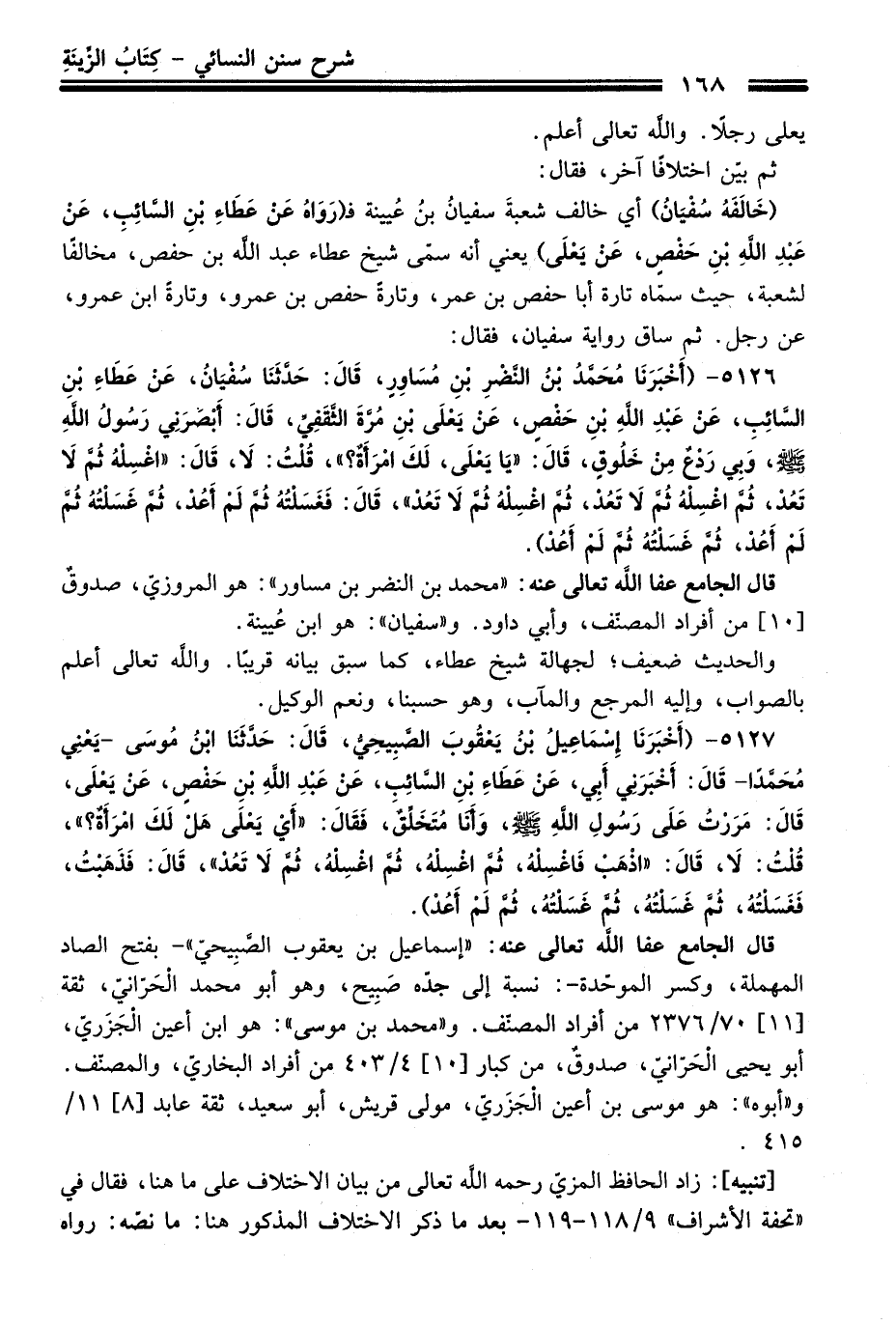 5127 - (أَخْبَرَنِي إِسْمَاعِيلُ بْنُ يَعْقُوبَ الصَّبِيحِيُّ، قَالَ: حَدَّثَنَا ابْنُ مُوسَى -يَعْنِي مُحَمَّدًا- قَالَ: أَخْبَرَنِي أَبِي، عَنْ عَطَاءِ بْنِ السَّائِبِ، عَنْ عَبْدِ اللَّهِ بْنِ حَفْصٍ، عَنْ يَعْلَى، قَالَ: مَرَرْتُ عَلَى رَسُولِ اللَّهِ -صلى الله عليه وسلم-، وَأَنَا مُتَخَلِّقٌ، فَقَالَ: "أَيْ يَعْلَى هَلْ لَكَ امْرَأَةٌ؟ "، قُلْتُ: لاَ، قَالَ: "اذْهَبْ فَاغْسِلْهُ، ثُمَّ اغْسِلْهُ، ثُمَّ اغْسِلْهُ، ثُمَّ لاَ تَعُدْ"، قَالَ: فَذَهَبْتُ، فَغَسَلْتُهُ، ثُمَّ غَسَلْتُهُ، ثُمَّ غَسَلْتُهُ، ثُمَّ لَمْ أَعُدْ).