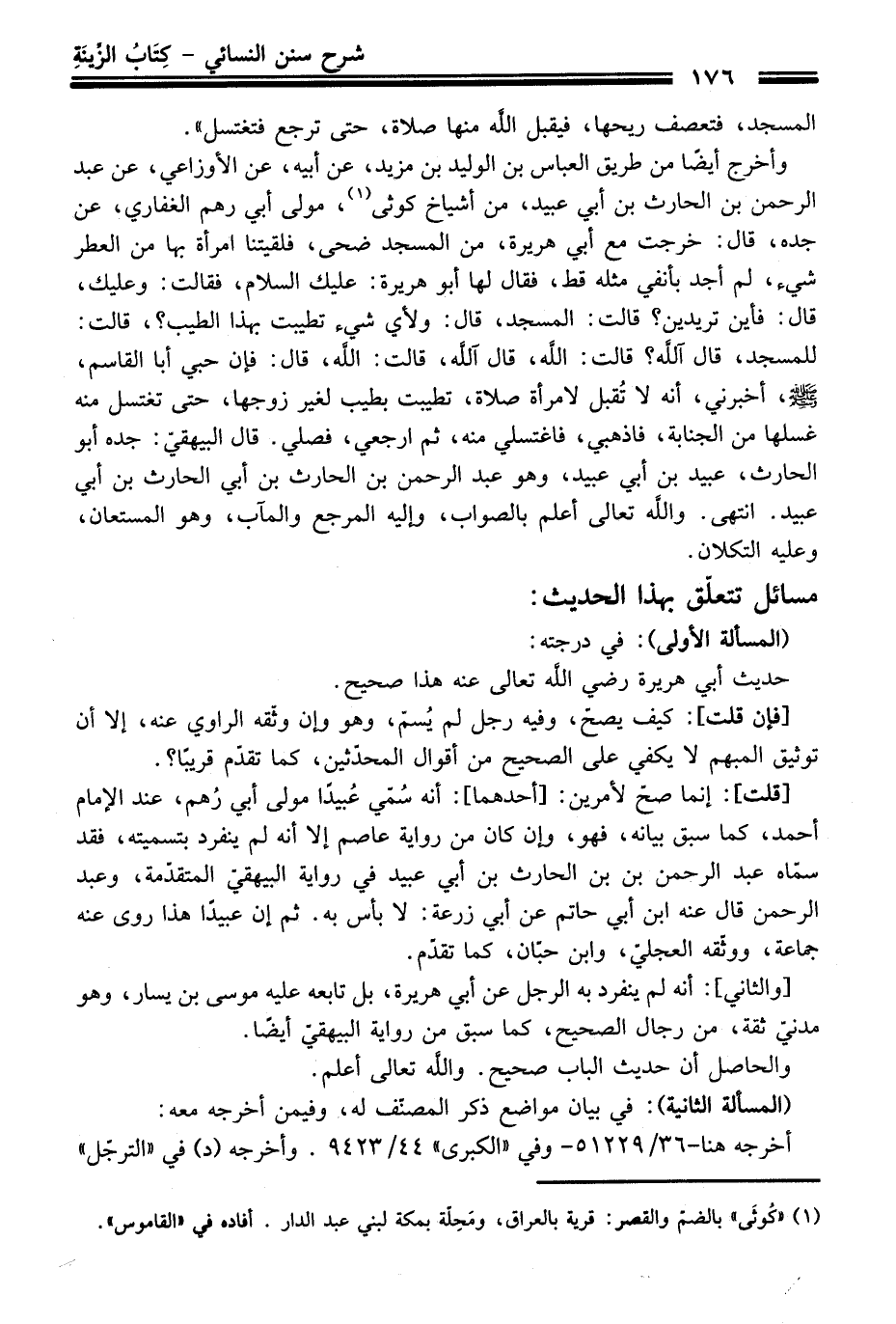 وأخرج أيضًا منْ طريق العبّاس بن الوليد بن مزيد، عن أبيه، عن الأوزاعي، عن عبد الرحمن بن الحارث بن أبي عبيد، منْ أشياخ كوثى (¬1)، مولى أبي رهم الغفاري، عن جده، قَالَ: خرجت مع أبي هريرة، منْ المسجد ضحى، فلقيتنا امرأة بها منْ العطر شيء، لم أجد بأنفي مثله قط، فَقَالَ لها أبو هريرة: عليك السلام، فقالت: وعليك، قَالَ: فأين تريدين؟ قالت: المسجد، قَالَ: ولأي شيء تطيبت بهذا الطيب؟، قالت: للمسجد، قَالَ آلله؟ قالت: الله، قَالَ آلله، قالت: الله، قَالَ: فإن حبي أبا القاسم، -صلى الله عليه وسلم-، أخبرني، أنه لا تُقبل لامرأة صلاة، تطيبت بطيب لغير زوجها، حَتَّى تغتسل منه غسلها منْ الجنابة، فاذهبي، فاغتسلي منه، ثم ارجعي، فصلي. قَالَ البيهقيّ: جده أبو الحارث، عبيد بن أبي عبيد، وهو عبد الرحمن بن الحارث بن أبي الحارث بن أبي عبيد. انتهى. والله تعالى أعلم بالصواب، وإليه المرجع والمآب، وهو المستعان، وعليه التكلان.
