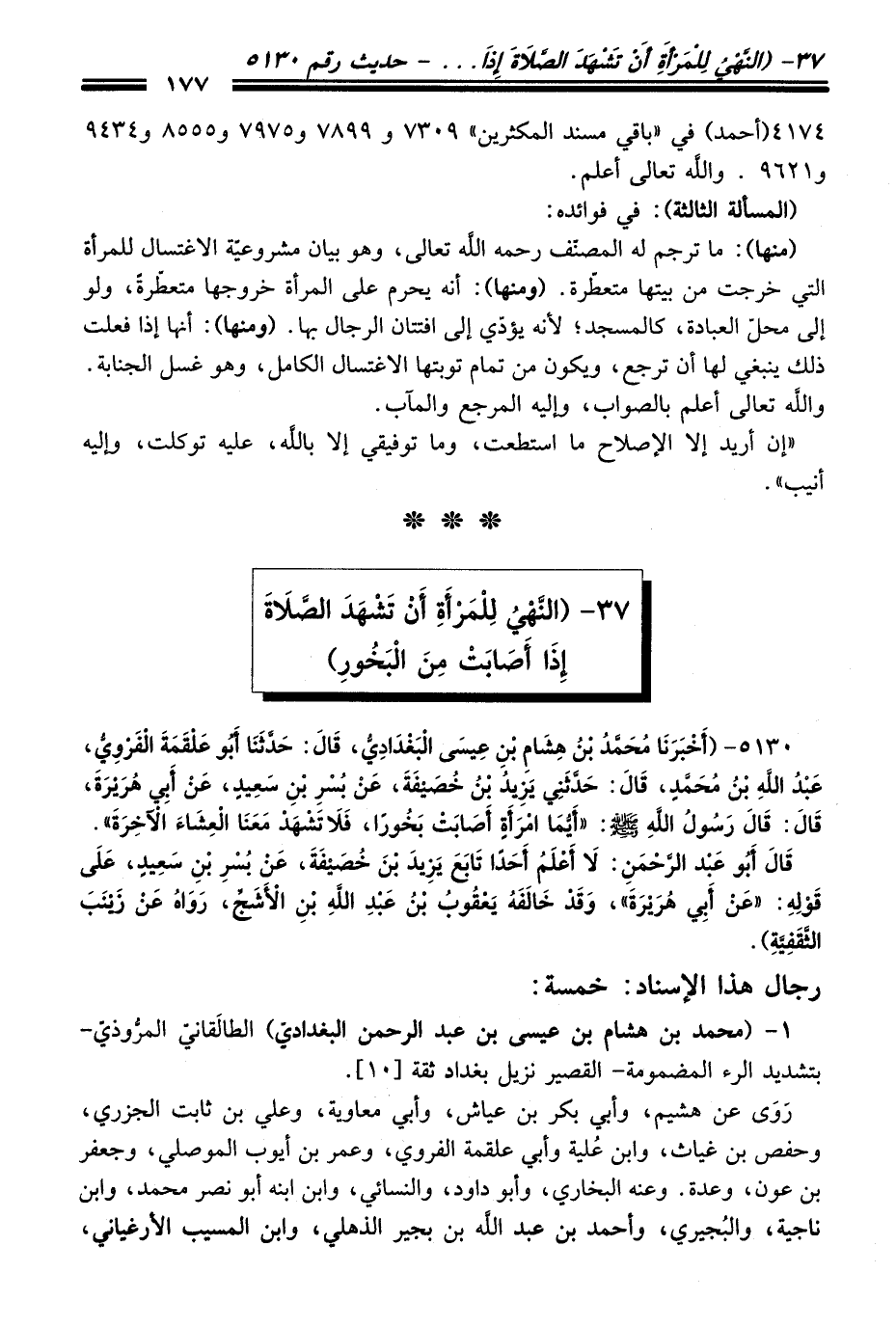 5130 - (أَخْبَرَنَا مُحَمَّدُ بْنُ هِشَامِ بْنِ عِيسَى الْبَغْدَادِيُّ، قَالَ: حَدَّثَنَا أَبُو عَلْقَمَةَ الْفَرْوِيُّ، عَبْدُ اللَّهِ بْنُ مُحَمَّدٍ، قَالَ: حَدَّثَنِي يَزِيدُ بْنُ خُصَيْفَةَ، عَنْ بُسْرِ بْنِ سَعِيدٍ، عَنْ أَبِي هُرَيْرَةَ، قَالَ: قَالَ رَسُولُ اللَّهِ -صلى الله عليه وسلم-: "أَيُّمَا امْرَأَةٍ أَصَابَتْ بَخُورًا، فَلاَ تَشْهَدْ مَعَنَا الْعِشَاءَ الآخِرَةَ".