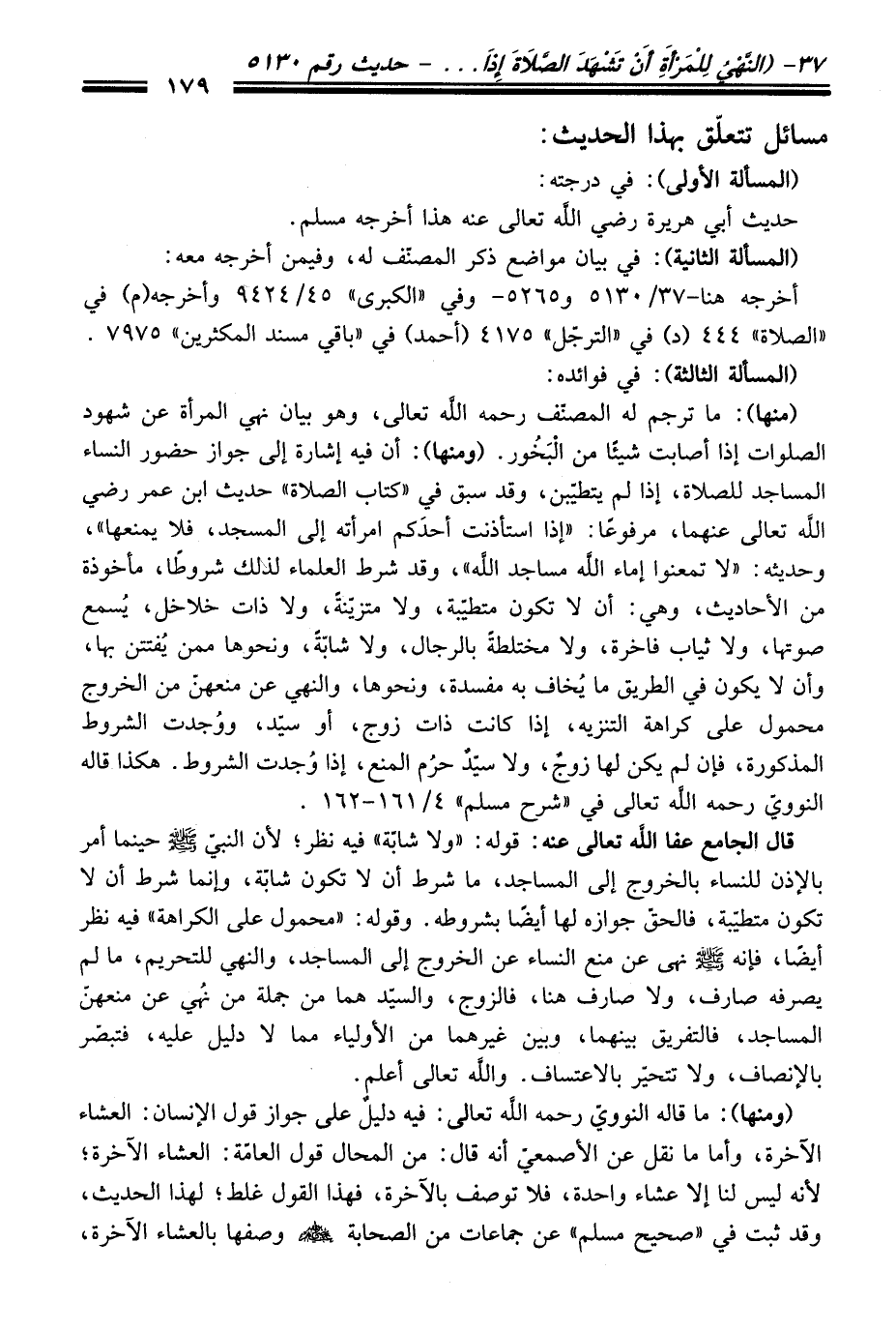 قَالَ الجامع عفا الله تعالى عنه: قوله: "ولا شابّة" فيه نظر؛ لأن النبيّ -صلى الله عليه وسلم- حينما أمر بالإذن للنساء بالخروج إلى المساجد، ما شرط أن لا تكون شابّة، وإنما شرط أن لا تكون متطيّبة، فالحقّ جوازه لها أيضًا بشروطه. وقوله: "محمول عَلَى الكراهة" فيه نظر أيضًا، فإنه -صلى الله عليه وسلم- نهى عن منع النِّساء عن الخروج إلى المساجد، والنهي للتحريم، ما لم يصرفه صارف، ولا صارف هنا، فالزوج، والسيّد هما منْ جملة منْ نُهي عن منعهنّ المساجد، فالتفريق بينهما، وبين غيرهما منْ الأولياء مما لا دليل عليه، فتبصّر بالإنصاف، ولا تتحيّر بالاعتساف. والله تعالى أعلم.