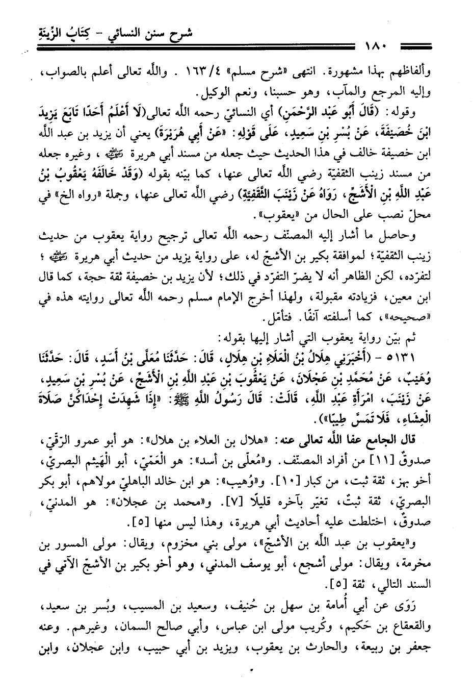 وقوله: (قَالَ أَبُو عَبْدِ الرَّحْمَنِ) أي النسائيّ رحمه الله تعالى (لاَ أَعْلَمُ أَحَدًا تَابَعَ يَزِيدَ بْنَ خُصَيْفَةَ، عَنْ بُسْرِ بْنِ سَعِيدٍ عَلَى قَوْلِهِ عَنْ أَبِي هُرَيْرَةَ) يعني أن يزيد بن عبد الله ابن خصيفة خالف فِي هَذَا الْحَدِيث حيث جعله منْ مسند أبي هريرة -رضي الله عنه-، وغيره جعله منْ مسند زينب الثقفيّة رضي الله تعالى عنها، كما بينه بقوله (وَقَدْ خَالَفَهُ يَعْقُوبُ بْنُ عَبْدِ اللَّهِ بْنِ الأَشَجِّ، رَوَاهُ عَنْ زَيْنَبَ الثَّقَفِيَّةِ) رضي الله تعالى عنها، وجملة "رواه الخ" فِي محل نصب عَلَى الحال منْ "يعقوب".