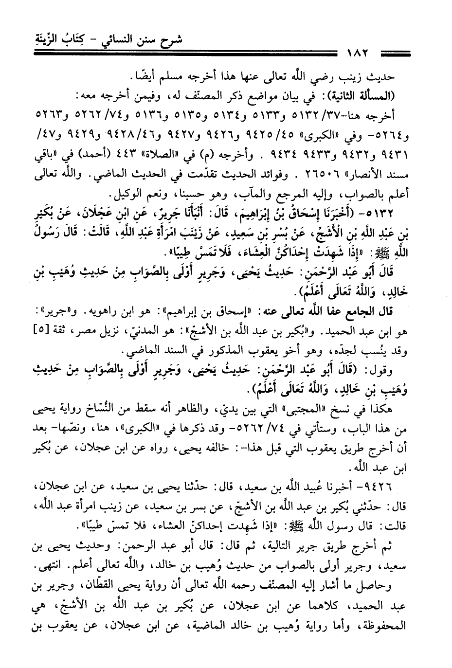 5132 - (أَخْبَرَنَا إِسْحَاقُ بْنُ إِبْرَاهِيمَ، قَالَ: أَنْبَأَنَا جَرِيرٌ، عَنِ ابْنِ عَجْلاَنَ، عَنْ بُكَيْرِ بْنِ عَبْدِ اللَّهِ بْنِ الأَشَجِّ، عَنْ بُسْرِ بْنِ سَعِيدٍ، عَنْ زَيْنَبَ امْرَأَةِ عَبْدِ اللَّهِ، قَالَتْ: قَالَ رَسُولُ اللَّهِ -صلى الله عليه وسلم-: "إِذَا شَهِدَتْ إِحْدَاكُنَّ الْعِشَاءَ، فَلاَ تَمَسَّ طِيبًا".