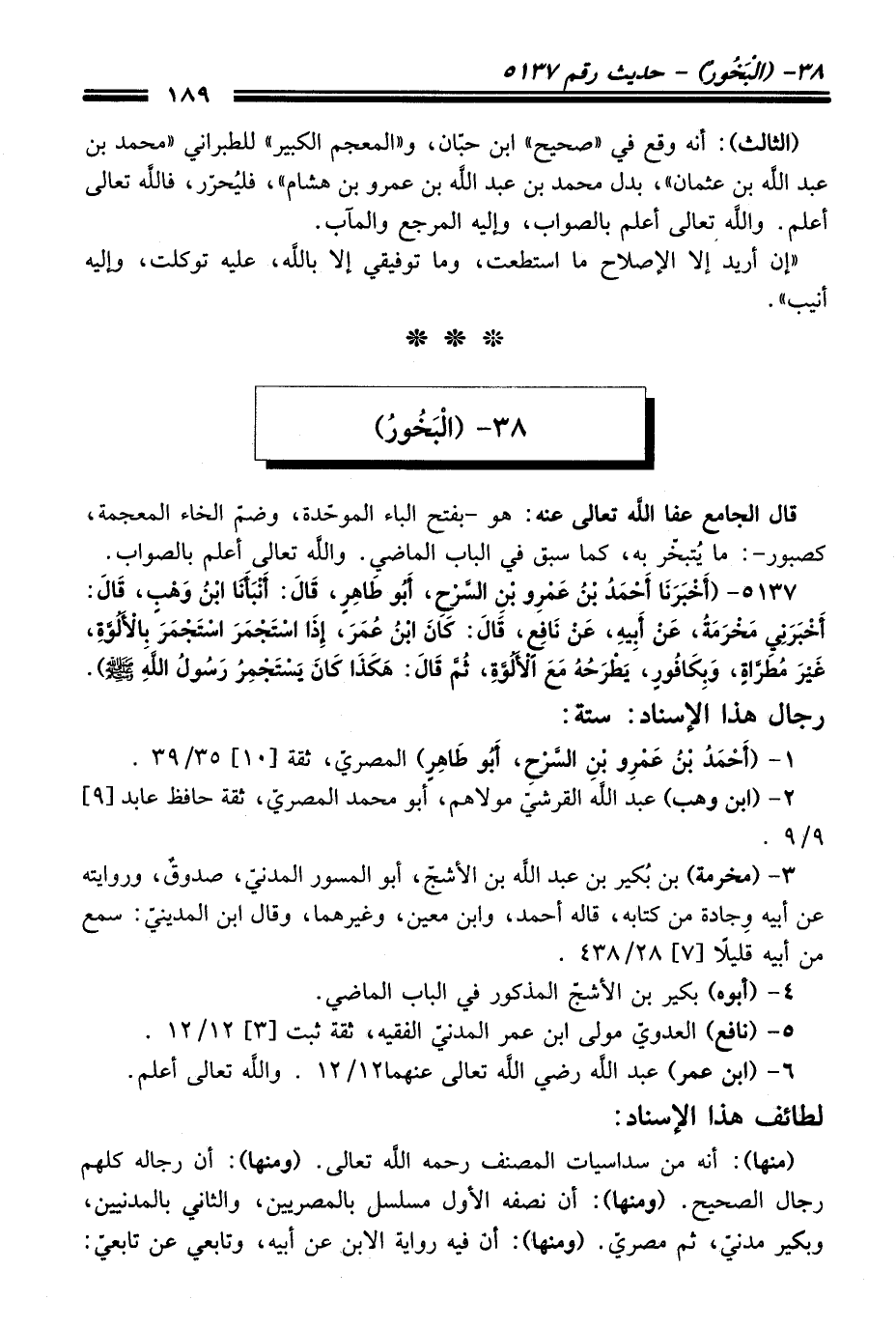 5137 - (أَخْبَرَنَا أَحْمَدُ بْنُ عَمْرِو بْنِ السَّرْحِ، أَبُو طَاهِرٍ، قَالَ: أَنْبَأَنَا ابْنُ وَهْبٍ، قَالَ: أَخْبَرَنِي مَخْرَمَةُ، عَنْ أَبِيهِ، عَنْ نَافِعٍ، قَالَ: كَانَ ابْنُ عُمَرَ، إِذَا اسْتَجْمَرَ اسْتَجْمَرَ بِالأُلُوَّةِ، غَيْرَ مُطَرَّاةٍ، وَبِكَافُورٍ، يَطْرَحُهُ مَعَ الأُلُوَّةِ، ثُمَّ قَالَ: هَكَذَا كَانَ يَسْتَجْمِرُ رَسُولُ اللَّهِ -صلى الله عليه وسلم-).