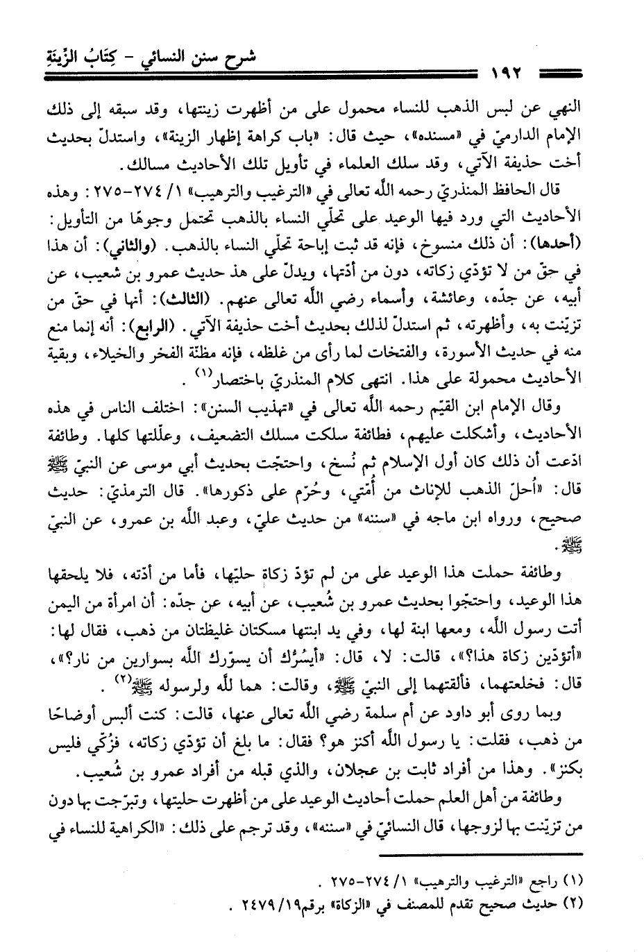 قَالَ الحافظ المنذريّ رحمه الله تعالى فِي "الترغيب والترهيب" 1/ 274 - 275: وهذه الأحاديث التي ورد فيها الوعيد عَلَى تحلّي النِّساء بالذهب تحتمل وجوهًا منْ التأويل: (أحدها): أن ذلك منسوخ، فإنه قد ثبت إباحة تحلّي النِّساء بالذهب. (والثاني): أن هَذَا فِي حقّ منْ لا تؤدّي زكاته، دون منْ أدّتها، ويدلّ عَلَى هذ حديث عمرو بن شعيب، عن أبيه، عن جدّه، وعائشة، وأسماء رضي الله تعالى عنهم. (الثالث): أنها فِي حقّ منْ تزيّنت به، وأظهرته، ثم استدلّ لذلك بحديث أخت حذيفة الآتي. (الرابع): أنه إنما منع منه فِي حديث الأسورة، والفتخات لما رأى منْ غلظه، فإنه مظنّة الفخر والخيلاء، وبقية الأحاديث محمولة عَلَى هَذَا. انتهى كلام المنذريّ باختصار (¬1).