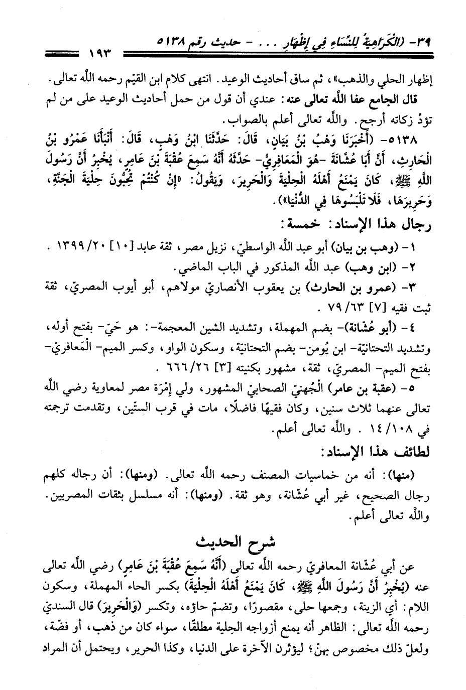 5138 - (أَخْبَرَنَا وَهْبُ بْنُ بَيَانٍ، قَالَ: حَدَّثَنَا ابْنُ وَهْبٍ، قَالَ: أَنْبَأَنَا عَمْرُو بْنُ الْحَارِثِ، أَنَّ أَبَا عُشَّانَةَ -هُوَ الْمَعَافِرِيُّ- حَدَّثَهُ أَنَّهُ سَمِعَ عُقْبَةَ بْنَ عَامِرٍ، يُخْبِرُ أَنَّ رَسُولَ اللَّهِ -صلى الله عليه وسلم-، كَانَ يَمْنَعُ أَهْلَهُ الْحِلْيَةَ وَالْحَرِيرَ، وَيَقُولُ: "إِنْ كُنْتُمْ تُحِبُّونَ حِلْيَةَ الْجَنَّةِ، وَحَرِيرَهَا، فَلاَ تَلْبَسُوهَا فِي الدُّنْيَا").