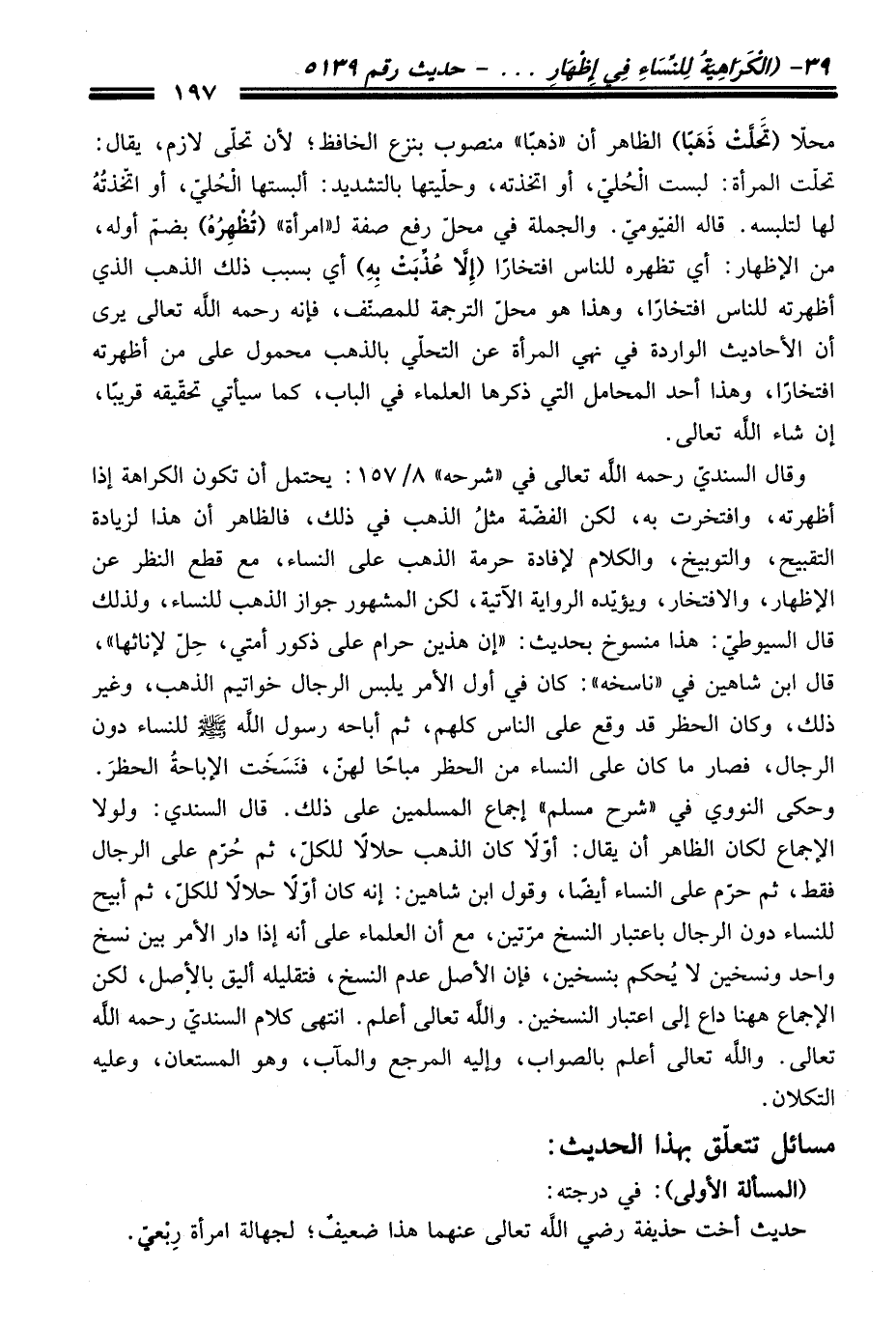 وَقَالَ السنديّ رحمه الله تعالى فِي "شرحه" 8/ 157: يحتمل أن تكون الكراهة إذا أظهرته، وافتخرت به، لكن الفضّة مثلُ الذهب فِي ذلك، فالظاهر أن هَذَا لزيادة التقبيح، والتوبيخ، والكلام لإفادة حرمة الذهب عَلَى النِّساء، مع قطع النظر عن الإظهار، والافتخار، ويؤيّده الرواية الآتية، لكن المشهور جواز الذهب للنساء، ولذلك قَالَ السيوطيّ: هَذَا منسوخ بحديث: "إن هذين حرام عَلَى ذكور أمتي، حِلّ لإناثها"، قَالَ ابن شاهين فِي "ناسخه": كَانَ فِي أول الأمر يلبس الرجال خواتيم الذهب، وغير ذلك، وكان الحظر قد وقع عَلَى النَّاس كلهم، ثم أباحه رسول الله -صلى الله عليه وسلم- للنساء دون الرجال، فصار ما كَانَ عَلَى النِّساء منْ الحظر مباحاً لهنّ، فنَسَخَت الإباحةُ الحظرّ. وحكى النوويّ فِي "شرح مسلم" إجماع المسلمين عَلَى ذلك. قَالَ السنديّ: ولولا الإجماع لكان الظاهر أن يقال: أوّلاً كَانَ الذهب حلالاً للكلّ، ثم حُرّم عَلَى الرجال فقط، ثم حرّم عَلَى النِّساء أيضًا، وقول ابن شاهين: إنه كَانَ أوّلاً حلالاً للكلّ، ثم أبيح للنساء دون الرجال باعتبار النسخ مرّتين، مع أن العلماء عَلَى أنه إذا دار الأمر بين نسخ واحد ونسخين لا يُحكم بنسخين، فإن الأصل عدم النسخ، فتقليله أليق بالأصل، لكن الإجماع هاهنا داع إلى اعتبار النسخين. والله تعالى أعلم. انتهى كلام السنديّ رحمه الله تعالى. والله تعالى أعلم بالصواب، وإليه المرجع والمآب، وهو المستعان، وعليه التكلان.