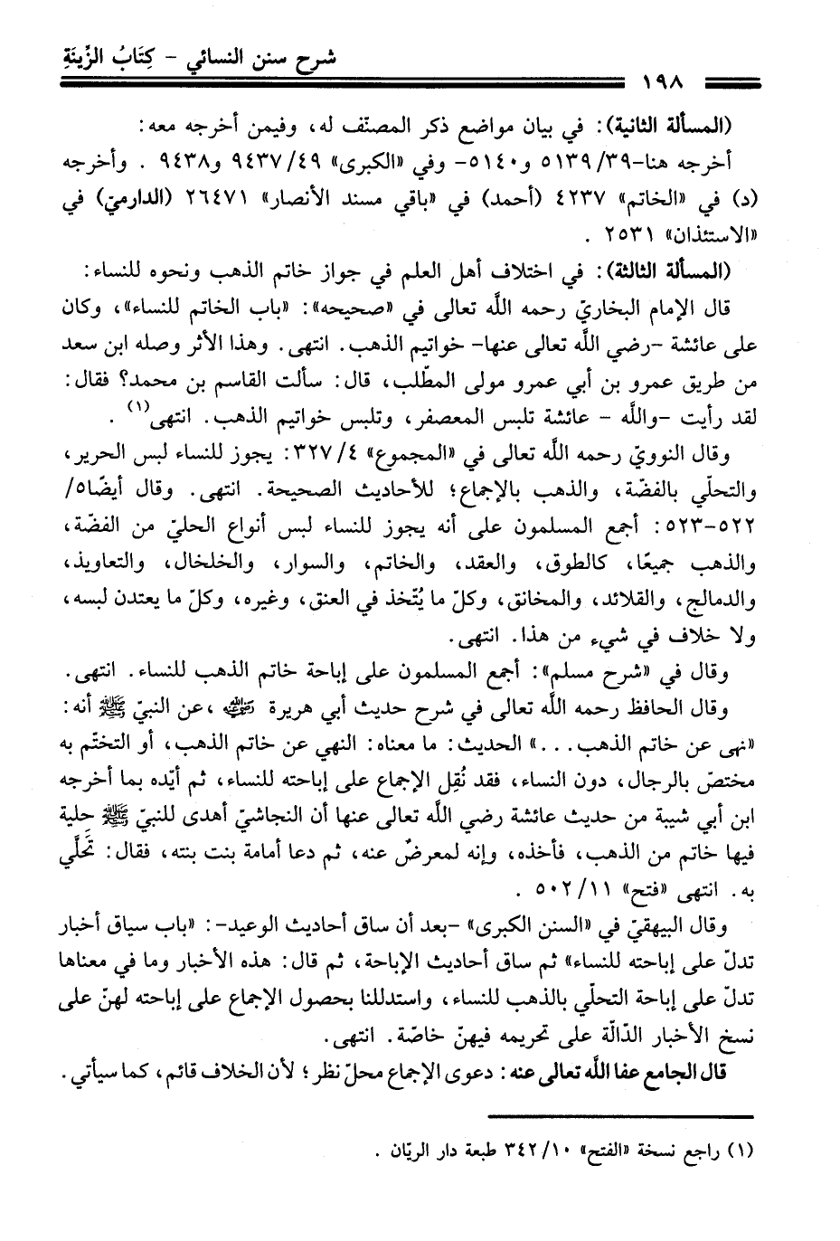 وَقَالَ الحافظ رحمه الله تعالى فِي شرح حديث أبي هريرة -رضي الله عنه-، عن النبيّ -صلى الله عليه وسلم- أنه: "نهى عن خاتم الذهب ... " الْحَدِيث: ما معناه: النهي عن خاتم الذهب، أو التختّم به مختصّ بالرجال، دون النِّساء، فقد نُقِل الإجماع عَلَى إباحته للنساء، ثم أيّده بما أخرجه ابن أبي شيبة منْ حديث عائشة رضي الله تعالى عنها أن النجاشيّ أهدى للنبيّ -صلى الله عليه وسلم- حلية فيها خاتم منْ الذهب، فأخذه، وإنه لمعرضٌ عنه، ثم دعا أمامة بنت بنته، فَقَالَ: تَحلَّي به. انتهى "فتح" 11/ 502.