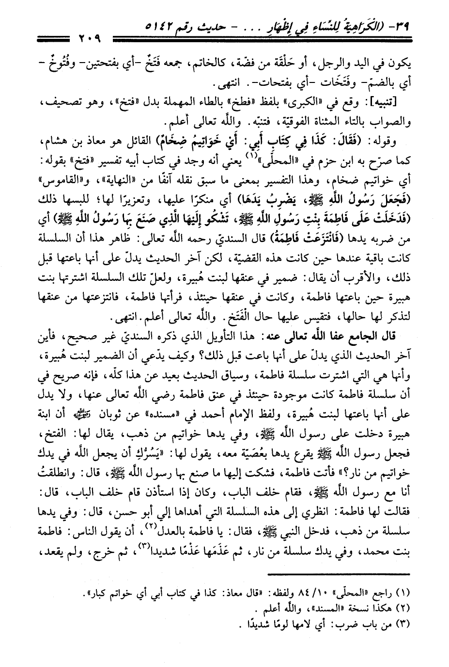 وقوله: (فَقَالَ: كَذَا فِي كِتَابِ أَبِي أَيْ: خَوَاتِيمَ ضِخَامٍ) القائل هو معاذ بن هشام، كما صرّح به ابن حزم فِي "المحلّى" (¬1) يعني أنه وجد فِي كتاب أبيه تفسير "فتخ" بقوله: أي خواتيم ضخام، وهذا التفسير بمعنى ما سبق نقله آنفاً منْ "النهاية"، و"القاموس" (فَجَعَلَ رَسُولُ اللَّهِ -صلى الله عليه وسلم-، يَضْرِبُ يَدَهَا) أي منكراً عليها، وتعزيراً لها؛ للبسها ذلك (فَدَخَلَتْ عَلَى فَاطِمَةَ بِنْتِ رَسُولِ اللَّهِ -صلى الله عليه وسلم-، تَشْكُو إِلَيْهَا الَّذِي صَنَعَ بِهَا رَسُولُ اللَّهِ -صلى الله عليه وسلم-) أي منْ ضربه يدها (فَانْتَزَعَتْ فَاطِمَةُ) قَالَ السنديّ رحمه الله تعالى: ظاهر هَذَا أن السلسلة كانت باقية عندها حين كانت هذه القضيّة، لكن آخر الْحَدِيث يدلّ عَلَى أنها باعتها قبل ذلك، والأقرب أن يقال: ضمير فِي عنقها لبنت هُبيرة، ولعلّ تلك السلسلة اشترتها بنت هبيرة حين باعتها فاطمة، وكانت فِي عنقها حينئذ، فرأتها فاطمة، فانتزعتها منْ عنقها لتذكر لها حالها، فتقيس عليها حال الْفَتَخ. والله تعالى أعلم. انتهى.