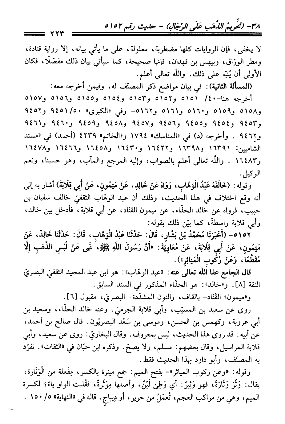 5152 - (أَخْبَرَنَا مُحَمَّدُ بْنُ بَشَّارٍ، قَالَ: حَدَّثَنَا عَبْدُ الْوَهَّابِ، قَالَ: حَدَّثَنَا خَالِدٌ، عَنْ مَيْمُونٍ، عَنْ أَبِي قِلاَبَةَ، عَنْ مُعَاوِيَةَ: "أَنَّ رَسُولَ اللَّهِ -صلى الله عليه وسلم-، نَهَى عَنْ لُبْسِ الذَّهَبِ إِلاَّ مُقَطَّعًا، وَعَنْ رُكُوبِ الْمَيَاثِرِ").