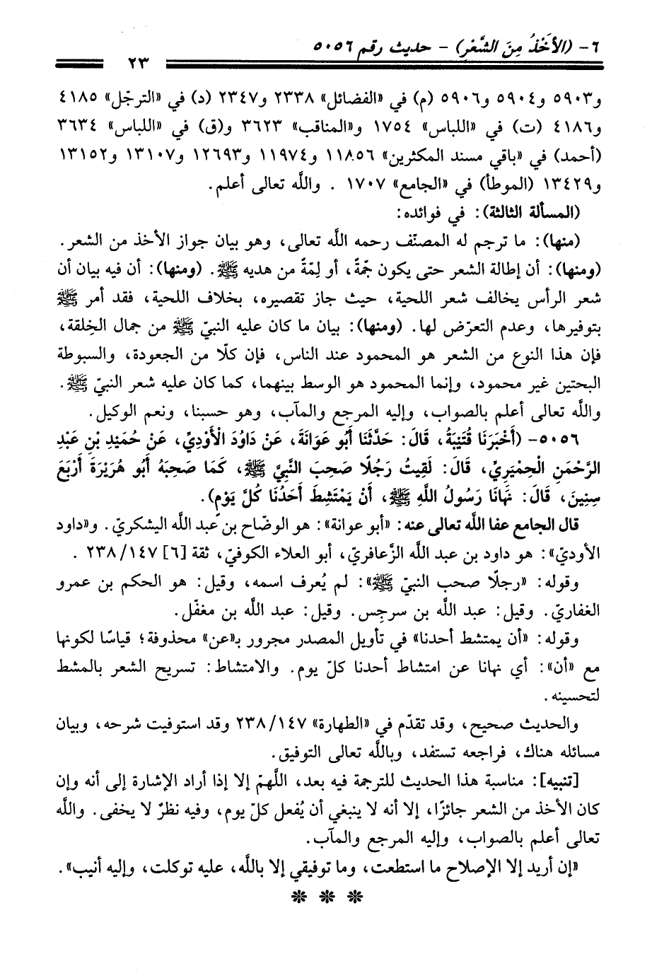 (منها): ما ترجم له المصنّف رحمه الله تعالى، وهو بيان جواز الأخذ منْ الشعر. (ومنها): أن إطالة الشعر حَتَّى يكون جمّةً، أو لِمّةً منْ هديه -صلى الله عليه وسلم-. (ومنها): أن فيه بيان أن شعر الرأس يخالف شعر اللحية، حيث جاز تقصيره، بخلاف اللحية، فقد أمر -صلى الله عليه وسلم- بتوفيرها، وعدم التعرّض لها. (ومنها): بيان ما كَانَ عليه النبيّ -صلى الله عليه وسلم- منْ جمال الخِلقة، فإن هَذَا النوع منْ الشعر هو المحمود عند النَّاس، فإن كلاًّ منْ الجعودة، والسبوطة البحتين غير محمود، وإنما المحمود هو الوسط بينهما، كما كَانَ عليه شعر النبيّ -صلى الله عليه وسلم-. والله تعالى أعلم بالصواب، وإليه المرجع والمآب، وهو حسبنا، ونعم الوكيل.