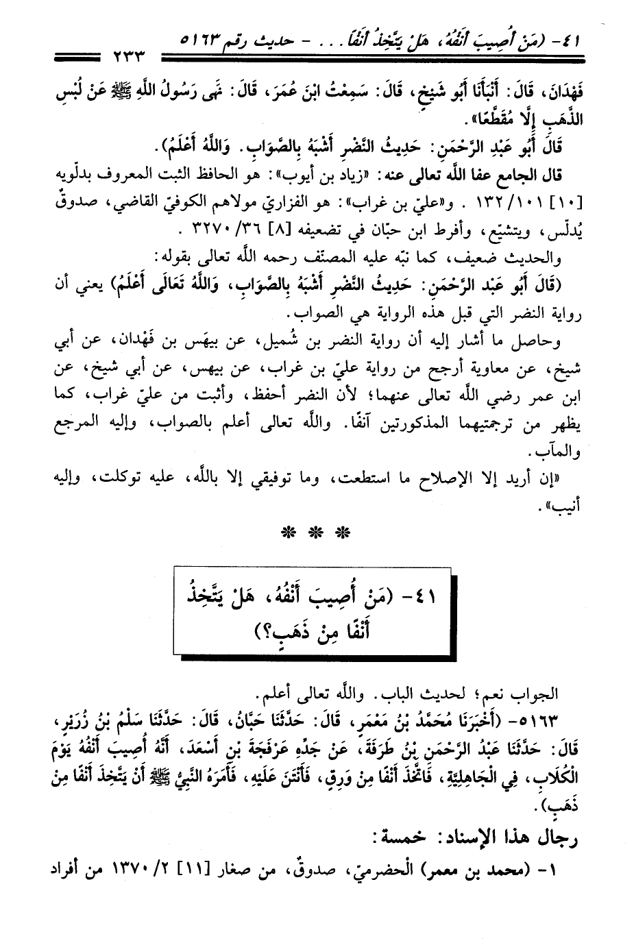 فَهْدَانَ، قَالَ: أَنْبَأَنَا أَبُو شَيْخٍ، قَالَ: سَمِعْتُ ابْنَ عُمَرَ، قَالَ: نَهَى رَسُولُ اللَّهِ -صلى الله عليه وسلم- عَنْ لُبْسِ الذَّهَبِ إِلاَّ مُقَطَّعًا".
