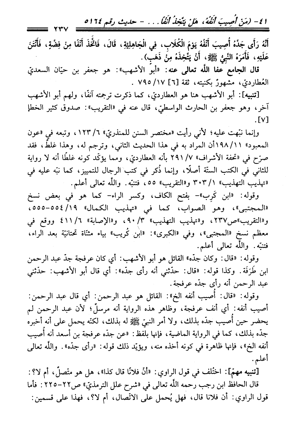 وقوله: "قَالَ: أُصيب أنفه الخ": القائل هو عبد الرحمن: أي قَالَ عبد الرحمن: أصيب أنفه: أي أنف عرفجة، وظاهر هذه الرواية أنه مرسلٌ؛ لأن عبد الرحمن لم يحضر حين أُصيب جدّه بذلك، ولا أمر النبيّ -صلى الله عليه وسلم- له بذلك، لكنّه يحمل عَلَى أنه أخبره جدّه بذلك، كما فِي الرواية الماضية، فإنها بلفظ: "عن جدّه عرفجة بن أسعد أنه أُصيب أنفه الخ"، فإنها ظاهرة فِي كونه أخذه منه، ويؤيد ذلك قوله: "رأى جدّه". والله تعالى أعلم.