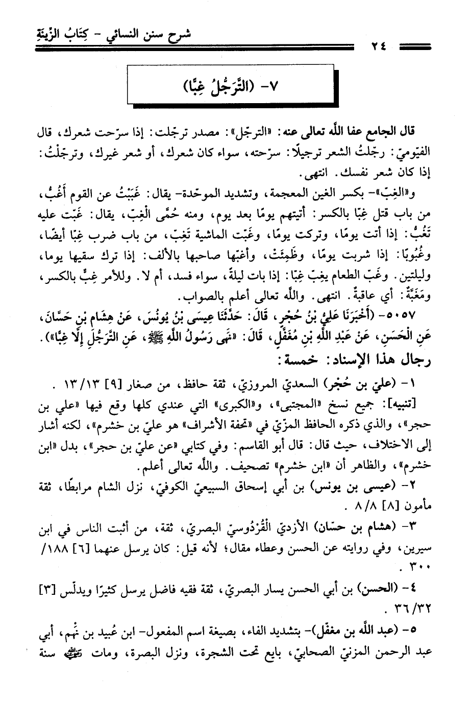 5057 - (أَخْبَرَنَا عَلِيُّ بْنُ حُجْرٍ، قَالَ: حَدَّثَنَا عِيسَى بْنُ يُونُسَ، عَنْ هِشَامِ بْنِ حَسَّانَ، عَنِ الْحَسَنِ، عَنْ عَبْدِ اللَّهِ بْنِ مُغَفَّلٍ، قَالَ: "نَهَى رَسُولُ اللَّهِ -صلى الله عليه وسلم-، عَنِ التَّرَجُّلِ إِلاَّ غِبًّا").