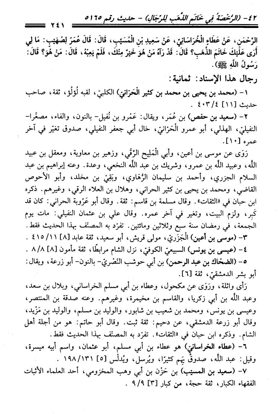 الرَّحْمَنِ، عَنْ عَطَاءٍ الْخُرَاسَانِيِّ، عَنْ سَعِيدِ بْنِ الْمُسَيَّبِ، قَالَ: قَالَ عُمَرُ لِصُهَيْبٍ: مَا لِي أَرَى عَلَيْكَ خَاتَمَ الذَّهَبِ؟ قَالَ: قَدْ رَآهُ مَنْ هُوَ خَيْرٌ مِنْكَ، فَلَمْ يَعِبْهُ، قَالَ: مَنْ هُوَ؟ قَالَ: رَسُولُ اللَّهِ -صلى الله عليه وسلم-).