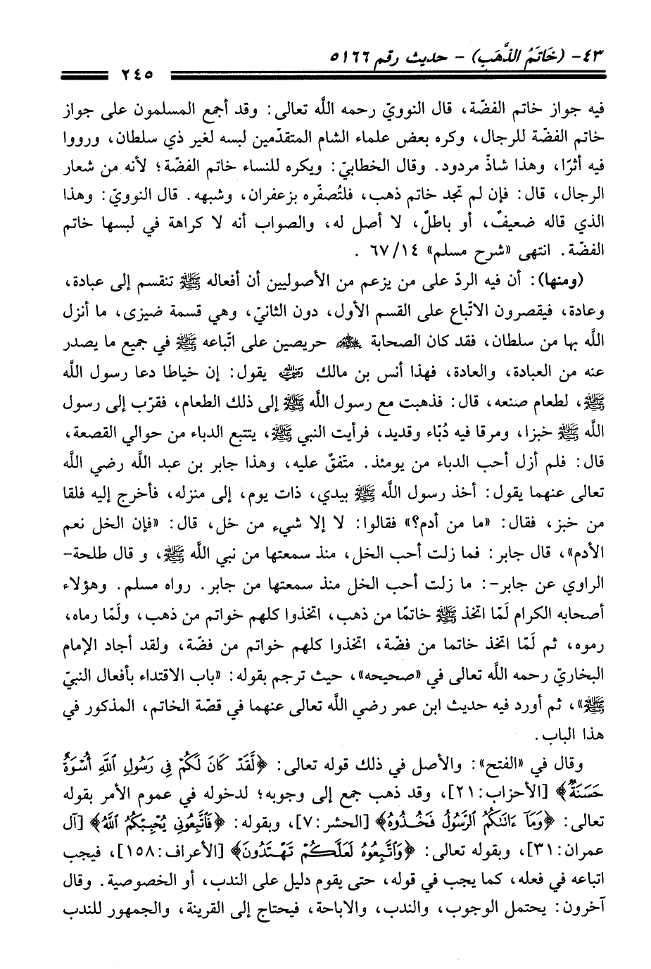 (ومنها): أن فيه الردّ عَلَى منْ يزعم منْ الأصوليين أن أفعاله -صلى الله عليه وسلم- تنقسم إلى عبادة، وعادة، فيقصرون الاتّباع عَلَى القسم الأول، دون الثاني، وهي قسمة ضيزى، ما أنزل الله بها منْ سلطان، فقد كَانَ الصحابة -رضي الله عنهم- حريصين عَلَى اتّباعه -صلى الله عليه وسلم- فِي جميع ما يصدر عنه منْ العبادة، والعادة، فهذا أنس بن مالك -رضي الله عنه- يقول: إن خياطا دعا رسول الله -صلى الله عليه وسلم-، لطعام صنعه، قَالَ: فذهبت مع رسول الله -صلى الله عليه وسلم- إلى ذلك الطعام، فقرّب إلى رسول الله -صلى الله عليه وسلم- خبزا، ومرقا فيه دُبّاء وقديد، فرأيت النبيّ -صلى الله عليه وسلم-، يتتبع الدباء منْ حوالي القصعة، قَالَ: فلم أزل أحب الدباء منْ يومئذ. متّفقٌ عليه، وهذا جابر بن عبد الله رضي الله تعالى عنهما يقول: أخذ رسول الله -صلى الله عليه وسلم- بيدي، ذات يوم، إلى منزله، فأخرج إليه فلقا منْ خبز، فَقَالَ: "ما منْ أدم؟ " فقالوا: لا إلا شيء منْ خل، قَالَ: "فإن الخل نعم الأدم"، قَالَ جابر: فما زلت أحب الخل، منذ سمعتها منْ نبي الله -صلى الله عليه وسلم-، وقَالَ طلحة -الراوي عن جابر-: ما زلت أحب الخل منذ سمعتها منْ جابر. رواه مسلم. وهؤلاء أصحابه الكرام لَمّا اتخذ -صلى الله عليه وسلم- خاتمًا منْ ذهب، اتخذوا كلهم خواتم منْ ذهب، ولَمّا رماه، رموه، ثم لَمّا اتخذ خاتما منْ فضّة، اتخذوا كلهم خواتم منْ فضّة، ولقد أجاد الإمام البخاريّ رحمه الله تعالى فِي "صحيحه"، حيث ترجم بقوله: "باب الاقتداء بأفعال النبيّ -صلى الله عليه وسلم-"، ثم أورد فيه حديث ابن عمر رضي الله تعالى عنهما فِي قصّة الخاتم، المذكور فِي هَذَا الباب.
