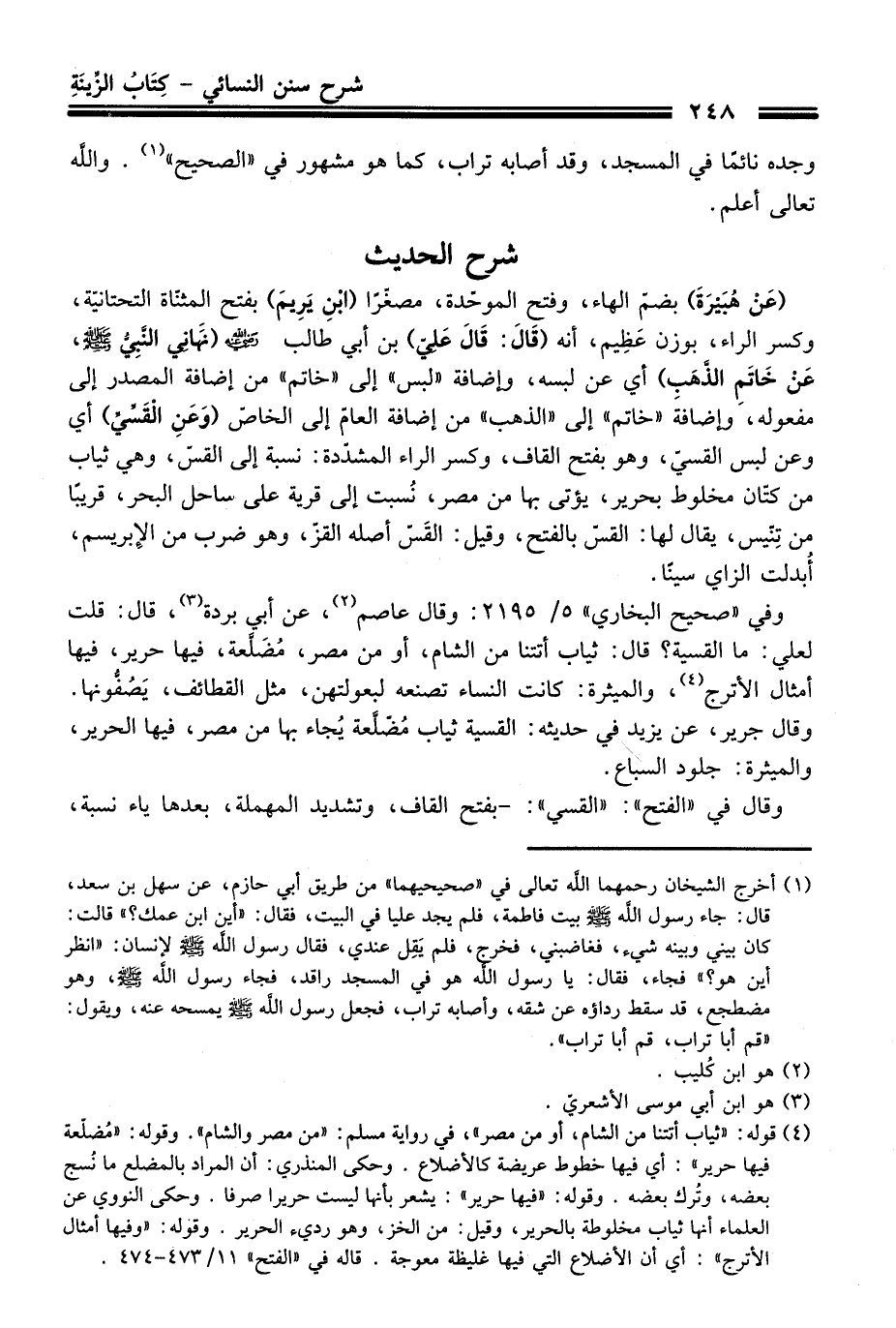 (عَنْ هُبَيْرَةَ) بضم الهاء، وفتح الموحدة، مصغراً (بْنِ يَرِيمَ) بفتح المثنّاة التحتانيّة، وكسر الراء، بوزن عَظِيم، أنه (قَالَ: قَالَ عَلِيّ) بن أبي طالب -رضي الله عنه- (نَهَانِي النَّبِيُّ -صلى الله عليه وسلم- عَنْ خَاتِمَ الذَّهَبِ) أي عن لبسه، وإضافة "لبس" إلى "خاتم" منْ إضافة المصدر إلى مفعوله، وإضافة "خاتم" إلى "الذهب" منْ إضافة العامّ إلى الخاصّ (وَعَنِ الْقَسِّيِّ) أي وعن لبس القسيّ، وهو بفتح القاف، وكسر الراء المشدّدة: نسبة إلى القسّ، وهي ثياب منْ كتّان مخلوط بحرير، يؤتى بها منْ مصر، نُسبت إلى قرية عَلَى ساحل البحر، قريباً منْ تِنّيس، يقال لها: القسّ بالفتح، وقيل: القَسّ أصله القرّ، وهو ضرب منْ الإِبريسم، أُبدلت الزاي سيناً.