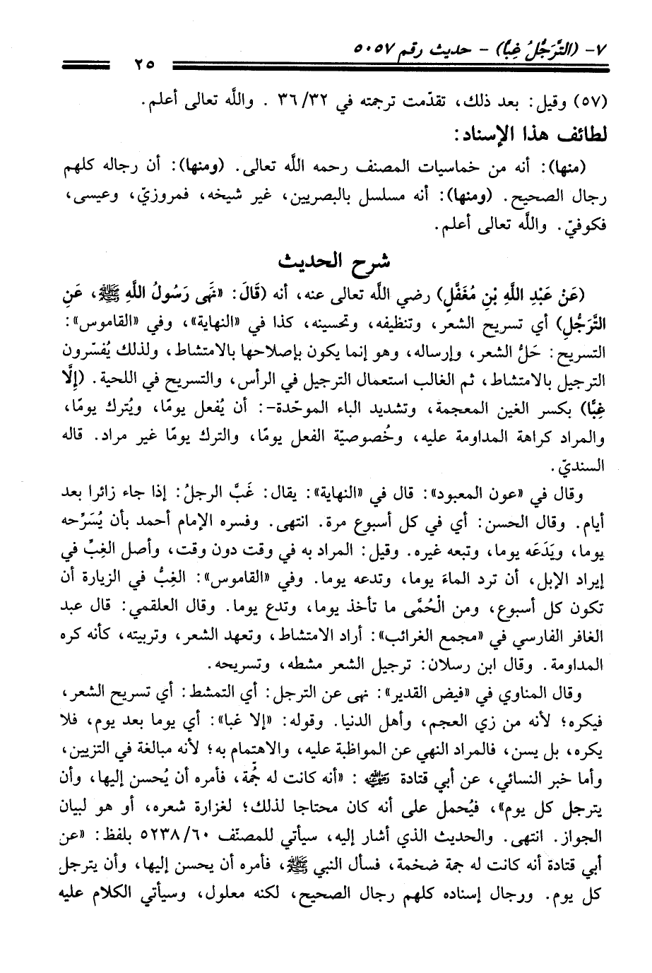 وَقَالَ المناوي فِي "فيض القدير": نهى عن الترجل: أي التمشط: أي تسريح الشعر، فيكره؛ لأنه منْ زي العجم، وأهل الدنيا. وقوله: "إلا غبا": أي يوما بعد يوم، فلا يكره، بل يسن، فالمراد النهي عن المواظبة عليه، والاهتمام به؛ لأنه مبالغة فِي التزيين، وأما خبر النسائيّ، عن أبي قتادة -رضي الله عنه-: "أنه كانت له جُمّة، فأمره أن يُحسن إليها، وأن يترجل كل يوم"، فيُحمل عَلَى أنه كَانَ محتاجا لذلك؛ لغزارة شعره، أو هو لبيان الجواز. انتهى. والحديث الذي أشار إليه، سيأتي للمصنّف 60/ 5238 بلفظ: "عن أبي قتادة أنه كانت له جمة ضخمة، فسأل النبيّ -صلى الله عليه وسلم-، فأمره أن يحسن إليها، وأن يترجل كل يوم. ورجال إسناده كلهم رجال الصحيح، لكنه معلول، وسيأتي الكلام عليه