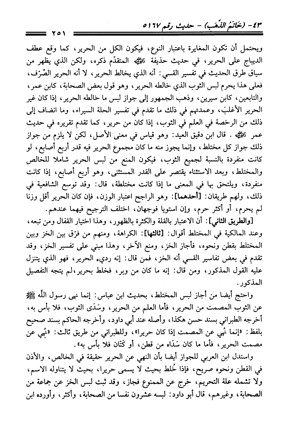 واحتج أيضًا منْ أجاز لبس المختلط، بحديث ابن عباس: إنما نهى رسول الله -صلى الله عليه وسلم- عن الثوب المصمت منْ الحرير، فأما العلم منْ الحرير، وسَدَى الثوب، فلا بأس به، أخرجه الطبراني بسند حسن هكذا، وأصله عند أبي داود، وأخرجه الحاكم بسند صحيح بلفظ: "إنما نُهي عن المصمت إذا كَانَ حريرا"، وللطبراني منْ طريق ثالث: "نُهَي عن مصمت الحرير، فأما ما كَانَ سَدَاه منْ قطن، أو كَتّان فلا بأس به".