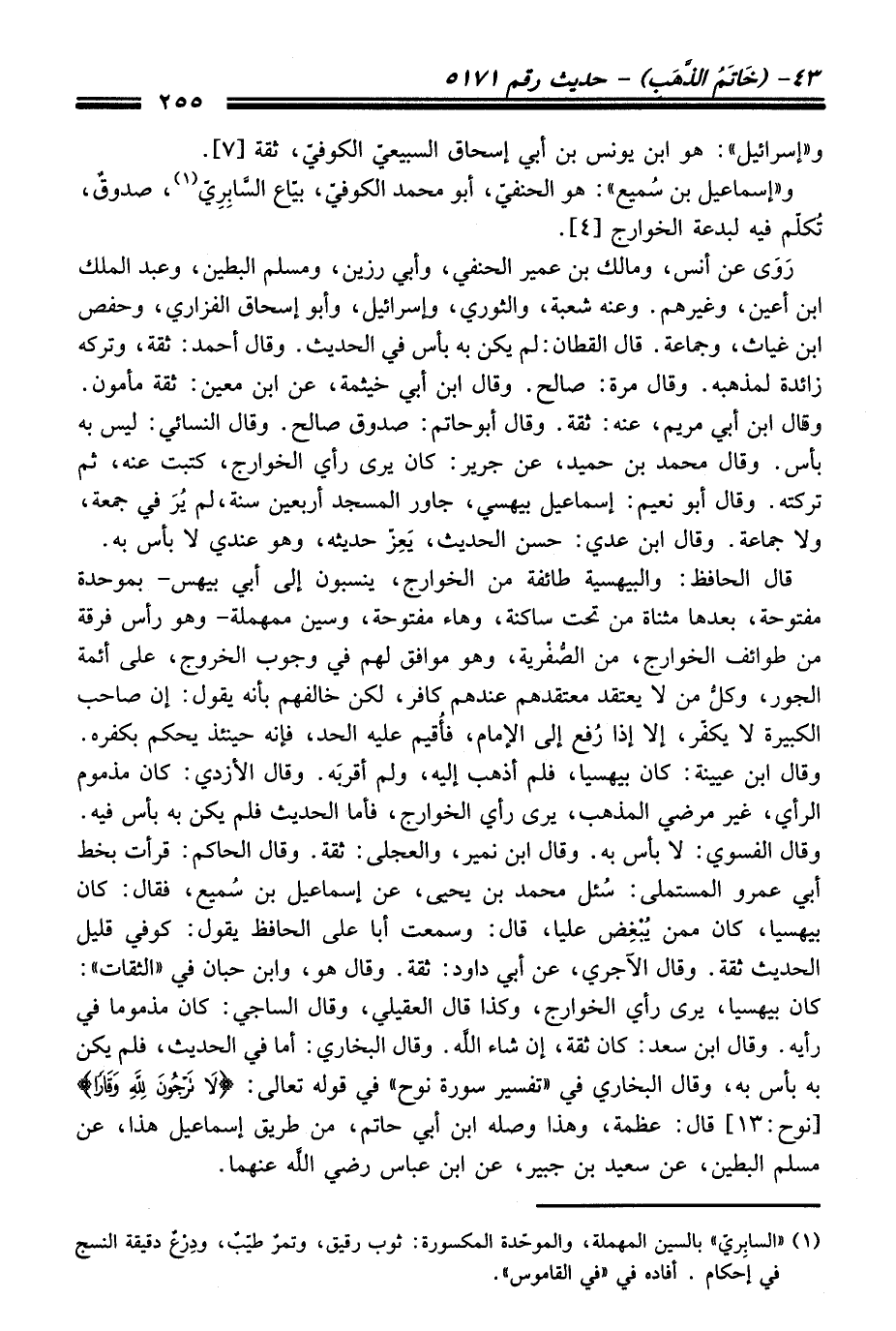 قَالَ الحافظ: والبيهسية طائفة منْ الخوارج، ينسبون إلى أبي بيهس -بموحدة مفتوحة، بعدها مثناة منْ تحت ساكنة، وهاء مفتوحة، وسين ممهملة- وهو رأس فرقة منْ طوائف الخوارج، منْ الصُّفْرية، وهو موافق لهم فِي وجوب الخروج، عَلَى أئمة الجور، وكلُّ منْ لا يعتقد معتقدهم عندهم كافر، لكن خالفهم بأنه يقول: إن صاحب الكبيرة لا يكفّر، إلا إذا رُفع إلى الإمام، فأُقيم عليه الحد، فإنه حينئذ يحكم بكفره. وَقَالَ ابن عيينة: كَانَ بيهسيا، فلم أذهب إليه، ولم أقربَه. وَقَالَ الأزدي: كَانَ مذموم الرأي، غير مرضي المذهب، يرى رأي الخوارج، فأما الْحَدِيث فلم يكن به بأس فيه. وَقَالَ الفسوي: لا بأس به. وَقَالَ ابن نمير، والعجلي: ثقة. وَقَالَ الحاكم: قرأت بخط أبي عمرو المستملي: سُئل محمد بن يحيى، عن إسماعيل بن سُميع، فَقَالَ: كَانَ بيهسيا، كَانَ ممن يُبْغِض عليا، قَالَ: وسمعت أبا عَلَى الحافظ يقول: كوفيّ قليل الْحَدِيث ثقة. وَقَالَ الآجري، عن أبي داود: ثقة. وَقَالَ هو، وابن حبّان فِي "الثقات": كَانَ بيهسيا، يرى رأي الخوارج، وكذا قَالَ العقيلي، وَقَالَ الساجي: كَانَ مذموما فِي رأيه. وَقَالَ ابن سعد: كَانَ ثقة، إن شاء الله. وَقَالَ البخاريّ: أما فِي الْحَدِيث، فلم يكن به بأس به، وَقَالَ البخاريّ فِي "تفسير سورة نوح" فِي قوله تعالى: {لَا تَرْجُونَ لِلَّهِ وَقَارًا} [نوح: 13] قَالَ: عظمة، وهذا وصله ابن أبي حاتم، منْ طريق إسماعيل هَذَا، عن مسلم البطين، عن سعيد بن جبير، عن ابن عباس رضي الله عنهما.