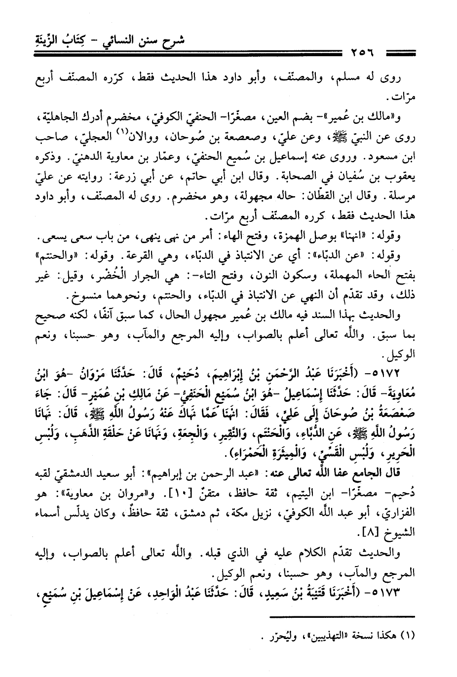 5172 - (أَخْبَرَنَا عَبْدُ الرَّحْمَنِ بْنُ إِبْرَاهِيمَ، دُحَيْمٌ، قَالَ: حَدَّثَنَا مَرْوَانُ -هُوَ ابْنُ مُعَاوِيَةَ- قَالَ: حَدَّثَنَا إِسْمَاعِيلُ -هُوَ ابْنُ سُمَيْعٍ الْحَنَفِيُّ- عَنْ مَالِكِ بْنِ عُمَيْرٍ قَالَ: جَاءَ صَعْصَعَةُ بْنُ صُوحَانَ إِلَى عَلِيٍّ، فَقَالَ: انْهَنَا عَمَّا نَهَاكَ عَنْهُ رَسُولُ اللَّهِ -صلى الله عليه وسلم-، قَالَ: نَهَانَا رَسُولُ اللَّهِ -صلى الله عليه وسلم-، عَنِ الدُّبَّاءِ، وَالْحَنْتَمِ، وَالنَّقِيرِ، وَالْجِعَةِ، وَنَهَانَا عَنْ حَلْقَةِ الذَّهَبِ، وَلُبْسِ الْحَرِيرِ، وَلُبْسِ الْقَسِّيِّ، وَالْمِيثَرَةِ الْحَمْرَاءِ).