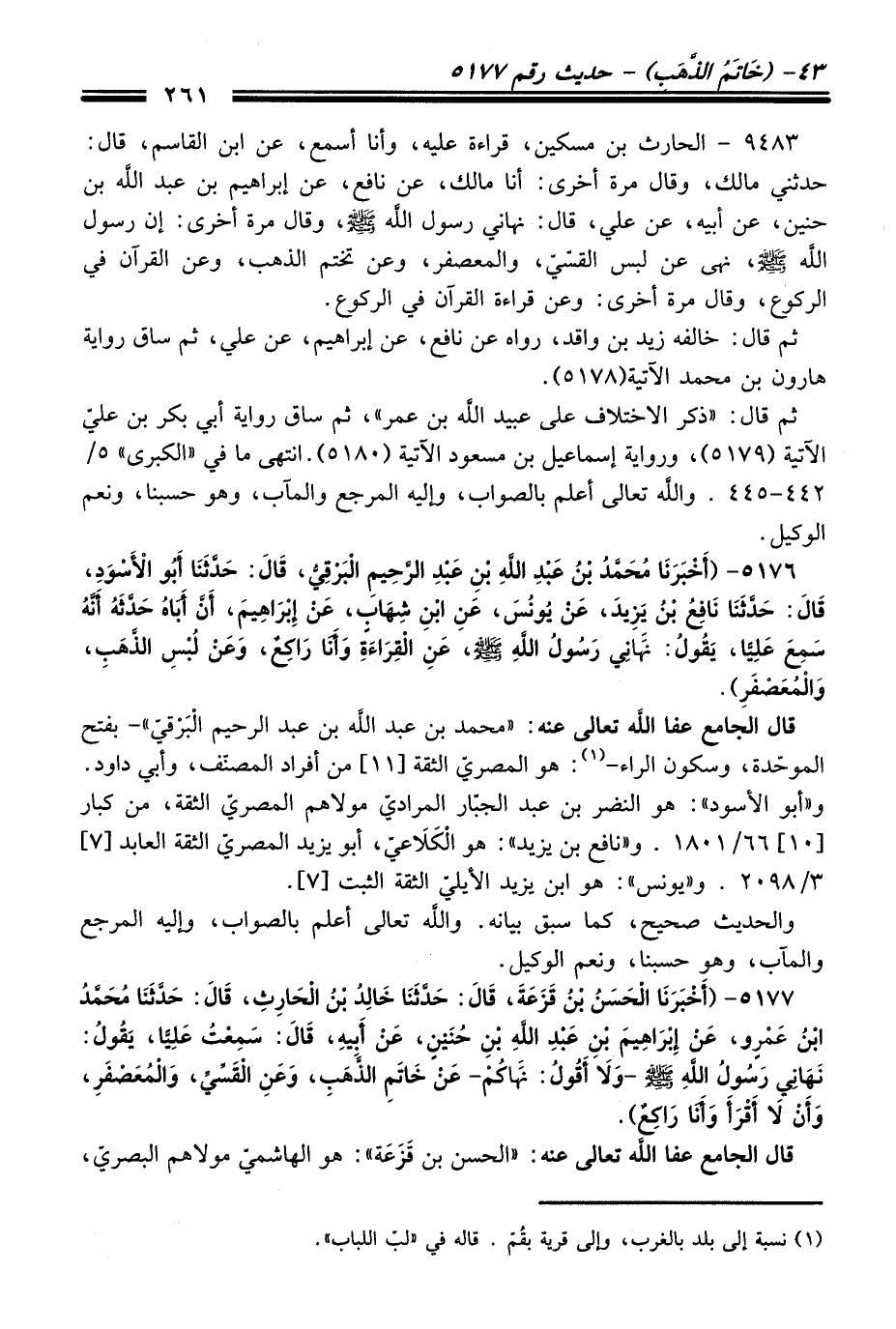 5176 - (أَخْبَرَنَا مُحَمَّدُ بْنُ عَبْدِ اللَّهِ بْنِ عَبْدِ الرَّحِيمِ الْبَرْقِيُّ، قَالَ: حَدَّثَنَا أَبُو الأَسْوَدِ، قَالَ: حَدَّثَنَا نَافِعُ بْنُ يَزِيدَ، عَنْ يُونُسَ، عَنِ ابْنِ شِهَابٍ، عَنْ إِبْرَاهِيمَ، أَنَّ أَبَاهُ حَدَّثَهُ أَنَّهُ سَمِعَ عَلِيًّا، يَقُولُ: نَهَانِي رَسُولُ اللَّهِ -صلى الله عليه وسلم-، عَنِ الْقِرَاءَةِ وَأَنَا رَاكِعٌ، وَعَنْ لُبْسِ الذَّهَبِ، وَالْمُعَصْفَرِ).