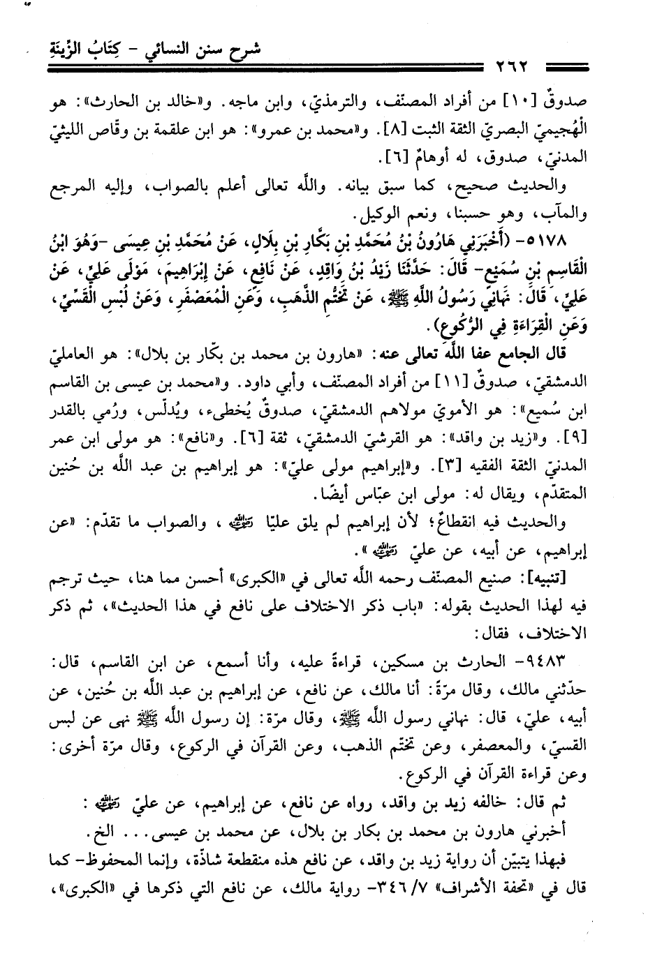 5178 - (أَخْبَرَنِي هَارُونُ بْنُ مُحَمَّدِ بْنِ بَكَّارِ بْنِ بِلاَلٍ، عَنْ مُحَمَّدِ بْنِ عِيسَى -وَهُوَ ابْنُ الْقَاسِمِ بْنِ سُمَيْعٍ- قَالَ: حَدَّثَنَا زَيْدُ بْنُ وَاقِدٍ، عَنْ نَافِعٍ، عَنْ إِبْرَاهِيمَ، مَوْلَى عَلِيٍّ، عَنْ عَلِيٍّ، قَالَ: نَهَانِي رَسُولُ اللَّهِ -صلى الله عليه وسلم-، عَنْ تَخَتُّمِ الذَّهَبِ، وَعَنِ الْمُعَصْفَرِ، وَعَنْ لُبْسِ الْقَسِّيِّ، وَعَنِ الْقِرَاءَةِ فِي الرُّكُوعِ).