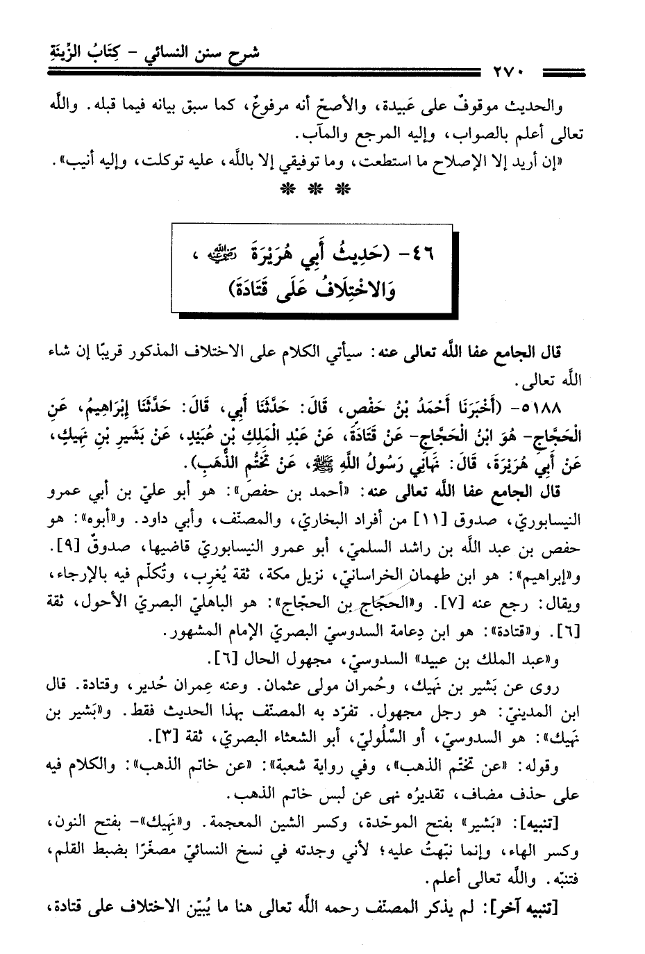 قَالَ الجامع عفا الله تعالى عنه: "أحمد بن حفص": هو أبو عليّ بن أبي عمرو النيسابوريّ، صدوقٌ [11] منْ أفراد البخاريّ، والمصنّف، وأبي داود. و"أبوه": هو حفص بن عبد الله بن راشد السلميّ، أبو عمرو النيسابوريّ قاضيها، صدوقٌ [9]. و"إبراهيم": هو ابن طهمان الخراسانيّ، نزيل مكة، ثقة يُغرِب، وتُكلّم فيه بالإرجاء، ويقال: رجع عنه [7]. و"الحجّاج بن الحجّاج": هو الباهليّ البصريّ الأحول، ثقة [6]. و"قتادة": هو ابن دِعامة السدوسيّ البصريّ الإمام المشهور.