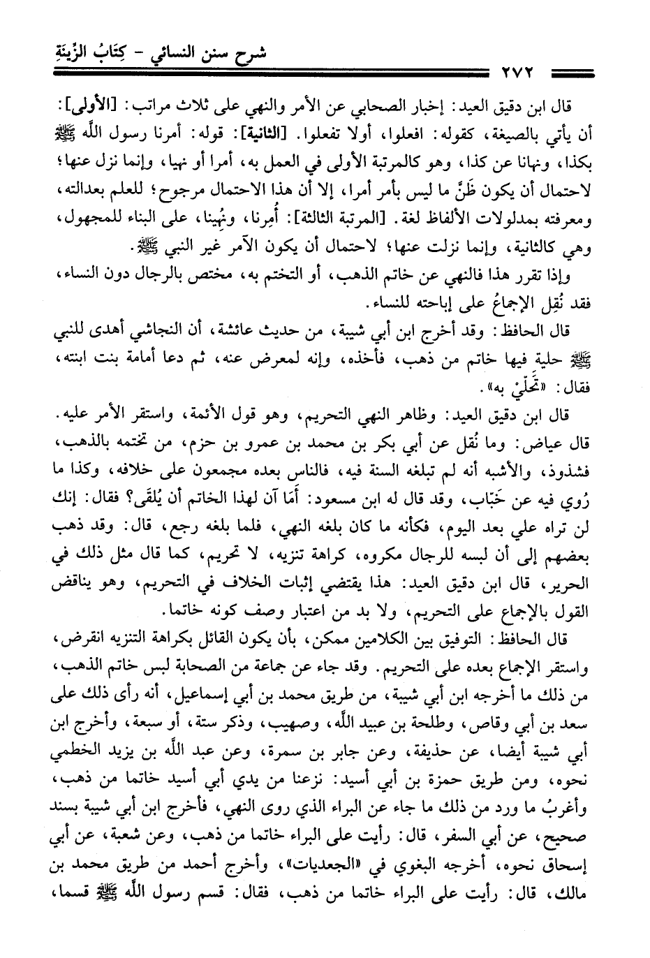 قَالَ ابن دقيق العيد: وظاهر النهي التحريم، وهو قول الأئمة، واستقر الأمر عليه. قَالَ عياض: وما نُقل عن أبي بكر بن محمد بن عمرو بن حزم، منْ تختمه بالذهب، فشذوذ، والأشبه أنه لم تبلغه السنة فيه، فالناس بعده مجمعون عَلَى خلافه، وكذا ما رُوي فيه عن خبّاب، وَقَدْ قَالَ له ابن مسعود: أما آن لهذا الخاتم أن يُلقَى؟ فَقَالَ: إنك لن تراه عليّ بعد اليوم، فكأنه ما كَانَ بلغه النهي، فلما بلغه رجع، قَالَ: وَقَدْ ذهب بعضهم إلى أن لبسه للرجال مكروه، كراهة تنزيه، لا تحريم، كما قَالَ مثل ذلك فِي الحرير، قَالَ ابن دقيق العيد: هَذَا يقتضي إثبات الخلاف فِي التحريم، وهو يناقض القول بالإجماع عَلَى التحريم، ولابد منْ اعتبار وصف كونه خاتما.