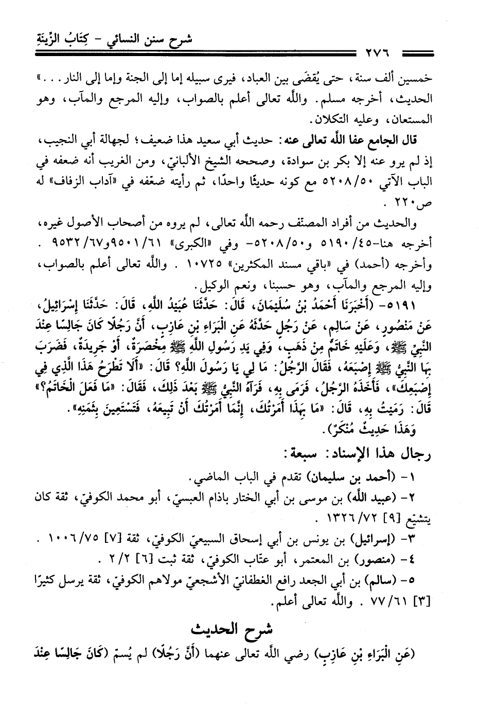 5191 - (أَخْبَرَنَا أَحْمَدُ بْنُ سُلَيْمَانَ، قَالَ: حَدَّثَنَا عُبَيْدُ اللَّهِ، قَالَ: حَدَّثَنَا إِسْرَائِيلُ، عَنْ مَنْصُورٍ، عَنْ سَالِمٍ، عَنْ رَجُلٍ حَدَّثَهُ عَنِ الْبَرَاءِ بْنِ عَازِبٍ، أَنَّ رَجُلاً كَانَ جَالِسًا عِنْدَ النَّبِيِّ -صلى الله عليه وسلم-، وَعَلَيْهِ خَاتَمٌ مِنْ ذَهَبٍ، وَفِي يَدِ رَسُولِ اللَّهِ -صلى الله عليه وسلم- مِخْصَرَةٌ، أَوْ جَرِيدَةٌ، فَضَرَبَ بِهَا النَّبِيُّ -صلى الله عليه وسلم- إِصْبَعَهُ، فَقَالَ الرَّجُلُ: مَا لِي يَا رَسُولَ اللَّهِ؟ قَالَ: "أَلاَ تَطْرَحُ هَذَا الَّذِي فِي إِصْبَعِكَ"، فَأَخَذَهُ الرَّجُلُ، فَرَمَى بِهِ، فَرَآهُ النَّبِيُّ -صلى الله عليه وسلم- بَعْدَ ذَلِكَ، فَقَالَ: "مَا فَعَلَ الْخَاتَمُ؟ " قَالَ: رَمَيْتُ بِهِ، قَالَ: "مَا بِهَذَا أَمَرْتُكَ، إِنَّمَا أَمَرْتُكَ أَنْ تَبِيعَهُ، فَتَسْتَعِينَ بِثَمَنِهِ".