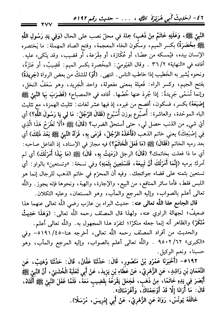 5192 - (أَخْبَرَنَا عَمْرُو بْنُ مَنْصُورٍ، قَالَ: حَدَّثَنَا عَفَّانُ، قَالَ: حَدَّثَنَا وُهَيْبٌ، عَنِ النُّعْمَانِ بْنِ رَاشِدٍ، عَنِ الزُّهْرِيِّ، عَنْ عَطَاءِ بْنِ يَزِيدَ، عَنْ أَبِي ثَعْلَبَةَ الْخُشَنِيِّ، أَنَّ النَّبِيَّ -صلى الله عليه وسلم- أَبْصَرَ فِي يَدِهِ خَاتَمًا، مِنْ ذَهَبٍ، فَجَعَلَ يَقْرَعُهُ بِقَضِيبٍ مَعَهُ، فَلَمَّا غَفَلَ النَّبِيُّ -صلى الله عليه وسلم- أَلْقَاهُ، قَالَ: "مَا أُرَانَا إِلاَّ قَدْ أَوْجَعْنَاكَ، وَأَغْرَمْنَاكَ".