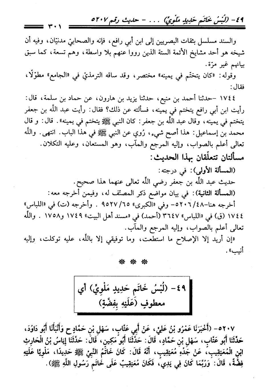 1744 - حدثنا أحمد بن منيع، حدثنا يزيد بن هارون، عن حماد بن سلمة، قَالَ: رأيت ابن أبي رافع يتختم فِي يمينه، فسألته عن ذلك؟ فَقَالَ: رأيت عبد الله بن جعفر يتختم فِي يمينه، وَقَالَ عبد الله بن جعفر: كَانَ النبيّ -صلى الله عليه وسلم- يتختم فِي يمينه". قَالَ: وَقَالَ محمد بن إسماعيل: هَذَا أصح شيء، رُوي عن النبيّ -صلى الله عليه وسلم- فِي هَذَا الباب. انتهى. والله تعالى أعلم بالصواب، وإليه المرجع والمآب، وهو المستعان، وعليه التكلان.