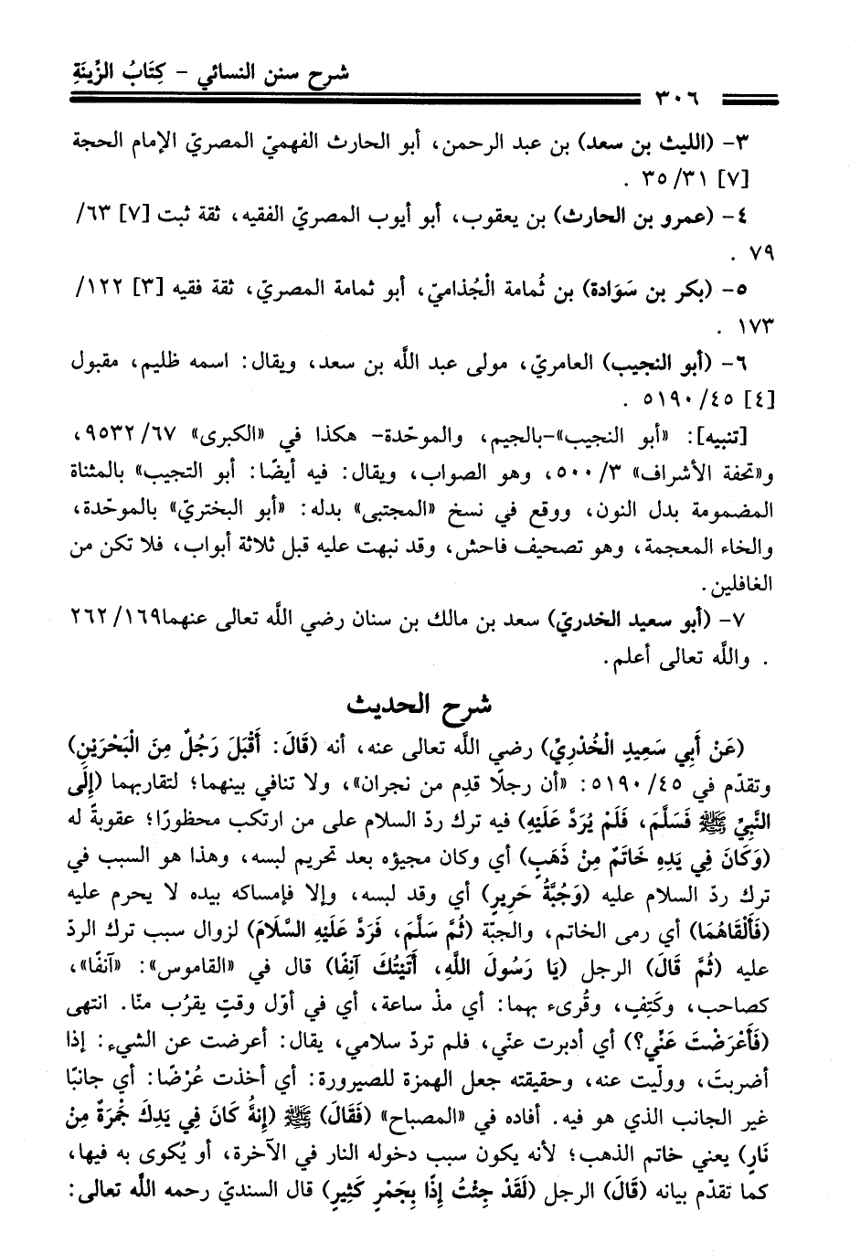 (عَنْ أَبِي سَعِيدٍ الْخُدْرِيِّ) رضي الله تعالى عنه، أنه (قَالَ: أَقْبَلَ رَجُلٌ مِنَ الْبَحْرَيْنِ) وتقدّم فِي 45/ 5190: "أن رجلاً قدِم منْ نجران"، ولا تنافي بينهما؛ لتقاربهما (إِلَى النَّبِيِّ -صلى الله عليه وسلم- فَسَلَّمَ، فَلَمْ يَرُدَّ عَلَيْهِ) فيه ترك ردّ السلام عَلَى منْ ارتكب محظورًا؛ عقوبةً له (وَكَانَ فِي يَدِهِ خَاتَمٌ مِنْ ذَهَبٍ) أي وكان مجيؤه بعد تحريم لبسه، وهذا هو السبب فِي ترك ردّ السلام عليه (وَجُبَّةُ حَرِيرٍ) أي وَقَدْ لبسه، وإلا فإمساكه بيده لا يحرم عليه (فَأَلْقَاهُمَا) أي رمى الخاتم، والجبّة (ثُمَّ سَلَّمَ، فَرَدَّ عَلَيْهِ السَّلاَمَ) لزوال سبب ترك الردّ عليه (ثُمَّ قَالَ) الرجل (يَا رَسُولَ اللَّهِ، أَتَيْتُكَ آنِفًا) قَالَ فِي "القاموس": "آنفاً"، كصاحب، وكَتِفٍ، وقُرىء بهما: أي مذ ساعة، أي فِي أوّل وقتٍ يقرُب منّا. انتهى (فَأَعْرَضْتَ عَنِّي؟) أي أدبرت عنّي، فلم تردّ سلامي، يقال: أعرضت عن الشيء: إذا أضربتَ، وولّيت عنه، وحقيقته جعل الهمزة للصيرورة: أي أخذت عُرْضاً: أي جانباً غير الجانب الذي هو فيه. أفاده فِي "المصباح" (فَقَالَ) -صلى الله عليه وسلم- (إِنَّهُ كَانَ فِي يَدِكَ جَمْرَةٌ مِنْ نَارٍ) يعني خاتم الذهب؛ لأنه يكون سبب دخوله النار فِي الآخرة، أو يُكوى به فيها، كما تقدّم بيانه (قَالَ) الرجل (لَقَدْ جِئْتُ إِذًا بِجَمْرٍ كَثِيرٍ) قَالَ السنديّ رحمه الله تعالى: